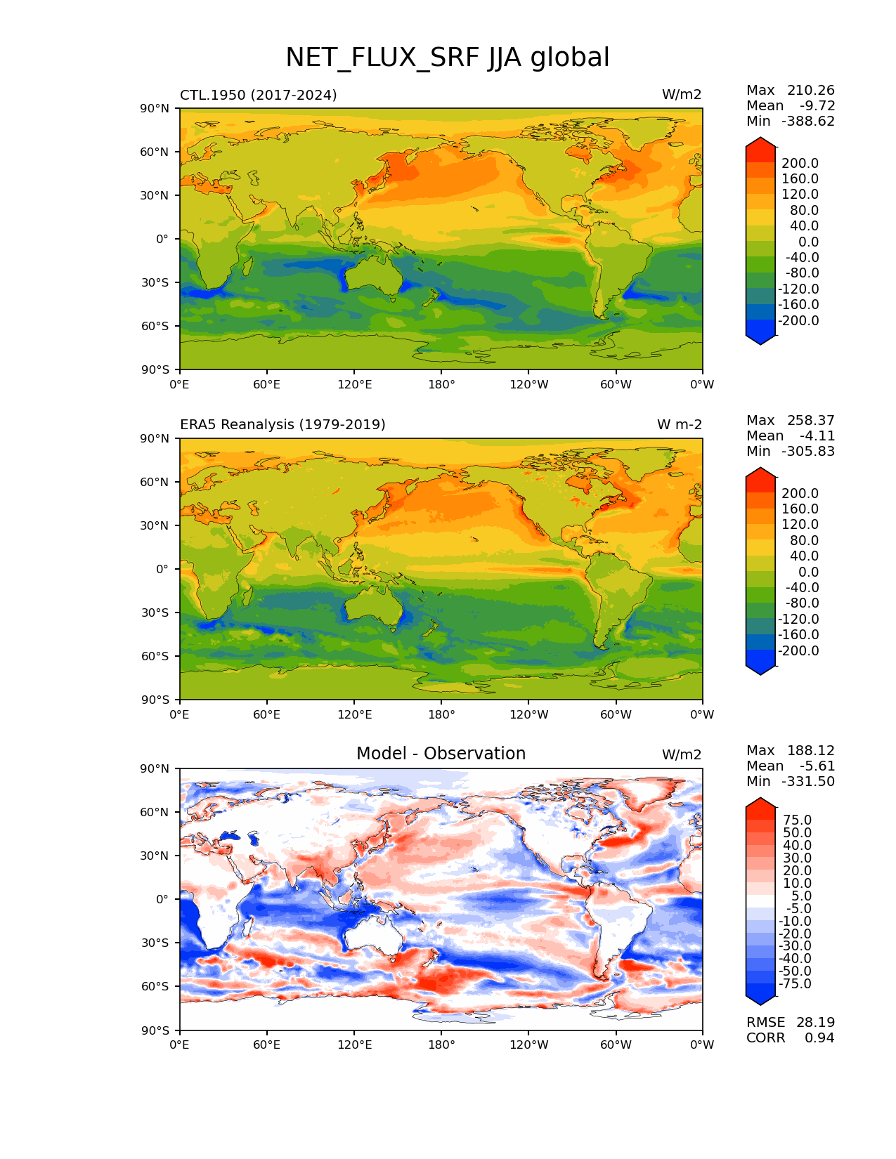 Use this command to recreate this image: | e3sm_diags lat_lon --no_viewer --reference_data_path '/global/cfs/cdirs/e3sm/acme_diags/obs_for_e3sm_diags/climatology/' --test_data_path '/pscratch/sd/x/xsongsio/DATA/CTL.1950/diag/clim_rgr/' --results_dir '/global/cfs/cdirs/e3sm/www/xsongsio/CTL.1950/8yr' --case_id 'ERA5' --run_type 'model_vs_obs' --sets 'lat_lon' --variables 'NET_FLUX_SRF' --seasons 'JJA' --regions 'global' --regrid_tool 'esmf' --regrid_method 'conservative' --num_workers '4' --main_title 'NET_FLUX_SRF JJA global' --backend 'mpl' --output_format 'png' --canvas_size_w '1212' --canvas_size_h '1628' --figsize '8.5' '11.0' --dpi '150' --arrows --contour_levels '-200' '-160' '-120' '-80' '-40' '0' '40' '80' '120' '160' '200' --test_name 'CTL.1950' --test_title ' ' --test_colormap 'cet_rainbow.rgb' --ref_name 'ERA5' --reference_name 'ERA5 Reanalysis' --reference_colormap 'cet_rainbow.rgb' --diff_title 'Model - Observation' --diff_colormap 'diverging_bwr.rgb' --diff_levels '-75' '-50' '-40' '-30' '-20' '-10' '-5' '5' '10' '20' '30' '40' '50' '75' --granulate 'variables' 'seasons' 'plevs' 'regions' --selectors 'sets' 'seasons' |