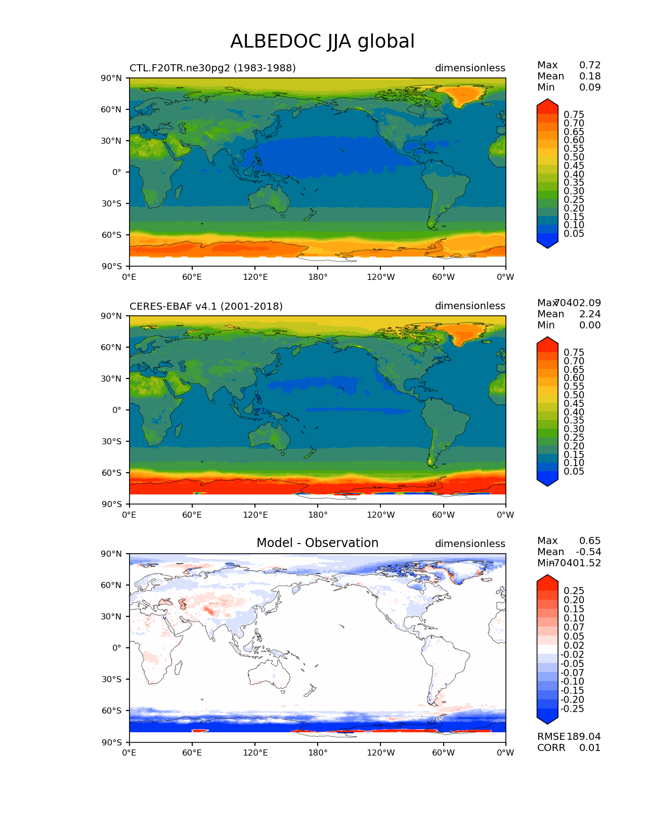 Use this command to recreate this image: | e3sm_diags lat_lon --no_viewer --case_id 'CERES-EBAF-TOA-v4.1' --sets 'lat_lon' --run_type 'model_vs_obs' --variables 'ALBEDOC' --seasons 'JJA' --regions 'global' --regrid_tool 'esmf' --regrid_method 'conservative' --main_title 'ALBEDOC JJA global' --backend 'mpl' --output_format 'png' --canvas_size_w '1212' --canvas_size_h '1628' --figsize '8.5' '11.0' --dpi '150' --arrows --contour_levels '0.05' '0.1' '0.15' '0.2' '0.25' '0.3' '0.35' '0.4' '0.45' '0.5' '0.55' '0.6' '0.65' '0.7' '0.75' --test_name 'CTL.F20TR.ne30pg2' --test_title ' ' --test_colormap 'cet_rainbow.rgb' --ref_name 'ceres_ebaf_toa_v4.1' --reference_name 'CERES-EBAF v4.1' --reference_colormap 'cet_rainbow.rgb' --diff_title 'Model - Observation' --diff_colormap 'diverging_bwr.rgb' --diff_levels '-0.25' '-0.2' '-0.15' '-0.1' '-0.07' '-0.05' '-0.02' '0.02' '0.05' '0.07' '0.1' '0.15' '0.2' '0.25' --num_workers '4' --granulate 'variables' 'seasons' 'plevs' 'regions' --selectors 'sets' 'seasons' --reference_data_path '/global/cfs/cdirs/e3sm/acme_diags/obs_for_e3sm_diags/climatology/' --test_data_path '/global/cscratch1/sd/xsongsio/E3SM_simulations/CTL.F20TR.ne30pg2/diag/clim_rgr/6yr/' --results_dir '/global/cfs/cdirs/e3sm/www/xsongsio/CTL.F20TR.ne30pg2/6yr' |