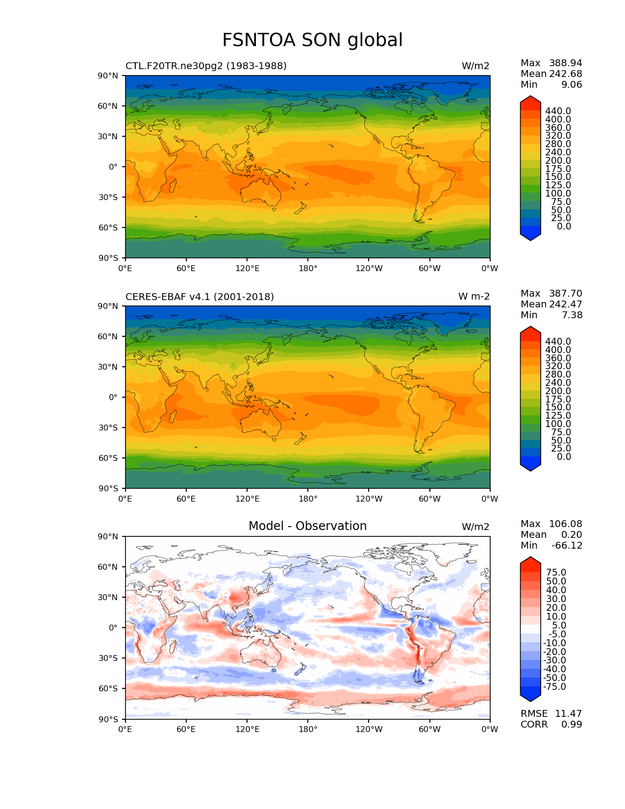 Use this command to recreate this image: | e3sm_diags lat_lon --no_viewer --case_id 'CERES-EBAF-TOA-v4.1' --sets 'lat_lon' --run_type 'model_vs_obs' --variables 'FSNTOA' --seasons 'SON' --regions 'global' --regrid_tool 'esmf' --regrid_method 'conservative' --main_title 'FSNTOA SON global' --backend 'mpl' --output_format 'png' --canvas_size_w '1212' --canvas_size_h '1628' --figsize '8.5' '11.0' --dpi '150' --arrows --contour_levels '0' '25' '50' '75' '100' '125' '150' '175' '200' '240' '280' '320' '360' '400' '440' --test_name 'CTL.F20TR.ne30pg2' --test_title ' ' --test_colormap 'cet_rainbow.rgb' --ref_name 'ceres_ebaf_toa_v4.1' --reference_name 'CERES-EBAF v4.1' --reference_colormap 'cet_rainbow.rgb' --diff_title 'Model - Observation' --diff_colormap 'diverging_bwr.rgb' --diff_levels '-75' '-50' '-40' '-30' '-20' '-10' '-5' '5' '10' '20' '30' '40' '50' '75' --num_workers '4' --granulate 'variables' 'seasons' 'plevs' 'regions' --selectors 'sets' 'seasons' --reference_data_path '/global/cfs/cdirs/e3sm/acme_diags/obs_for_e3sm_diags/climatology/' --test_data_path '/global/cscratch1/sd/xsongsio/E3SM_simulations/CTL.F20TR.ne30pg2/diag/clim_rgr/6yr/' --results_dir '/global/cfs/cdirs/e3sm/www/xsongsio/CTL.F20TR.ne30pg2/6yr' |