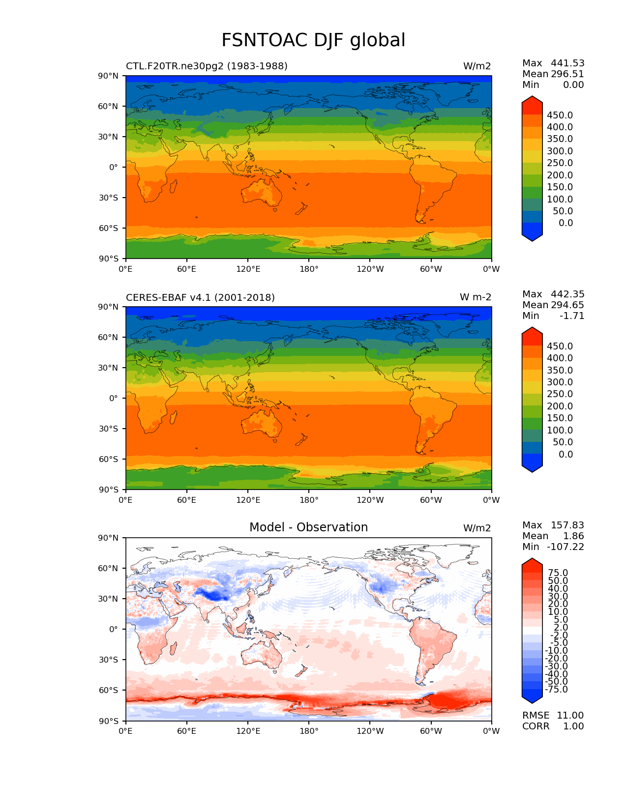 Use this command to recreate this image: | e3sm_diags lat_lon --no_viewer --case_id 'CERES-EBAF-TOA-v4.1' --sets 'lat_lon' --run_type 'model_vs_obs' --variables 'FSNTOAC' --seasons 'DJF' --regions 'global' --regrid_tool 'esmf' --regrid_method 'conservative' --main_title 'FSNTOAC DJF global' --backend 'mpl' --output_format 'png' --canvas_size_w '1212' --canvas_size_h '1628' --figsize '8.5' '11.0' --dpi '150' --arrows --contour_levels '0' '50' '100' '150' '200' '250' '300' '350' '400' '450' --test_name 'CTL.F20TR.ne30pg2' --test_title ' ' --test_colormap 'cet_rainbow.rgb' --ref_name 'ceres_ebaf_toa_v4.1' --reference_name 'CERES-EBAF v4.1' --reference_colormap 'cet_rainbow.rgb' --diff_title 'Model - Observation' --diff_colormap 'diverging_bwr.rgb' --diff_levels '-75' '-50' '-40' '-30' '-20' '-10' '-5' '-2' '2' '5' '10' '20' '30' '40' '50' '75' --num_workers '4' --granulate 'variables' 'seasons' 'plevs' 'regions' --selectors 'sets' 'seasons' --reference_data_path '/global/cfs/cdirs/e3sm/acme_diags/obs_for_e3sm_diags/climatology/' --test_data_path '/global/cscratch1/sd/xsongsio/E3SM_simulations/CTL.F20TR.ne30pg2/diag/clim_rgr/6yr/' --results_dir '/global/cfs/cdirs/e3sm/www/xsongsio/CTL.F20TR.ne30pg2/6yr' |