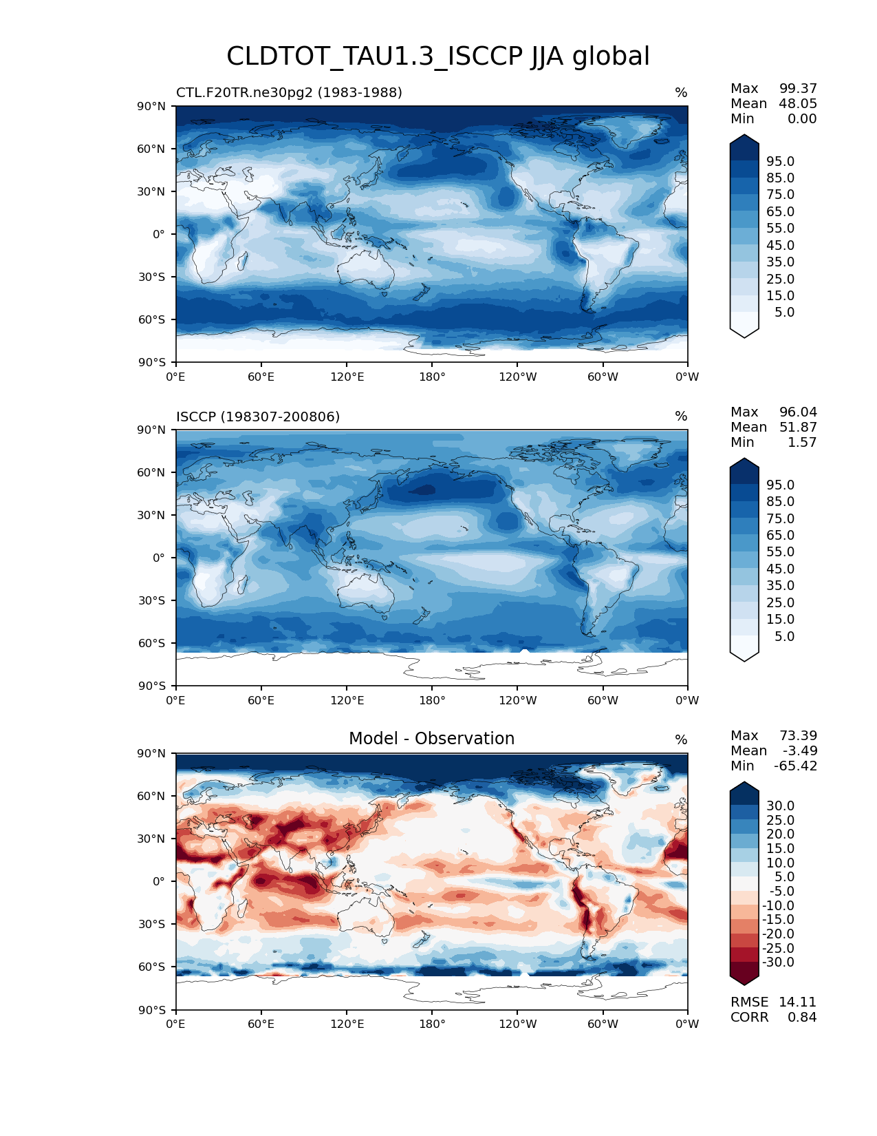 Use this command to recreate this image: | e3sm_diags lat_lon --no_viewer --case_id 'Cloud ISCCP' --sets 'lat_lon' --run_type 'model_vs_obs' --variables 'CLDTOT_TAU1.3_ISCCP' --seasons 'JJA' --regions 'global' --regrid_tool 'esmf' --regrid_method 'conservative' --main_title 'CLDTOT_TAU1.3_ISCCP JJA global' --backend 'mpl' --output_format 'png' --canvas_size_w '1212' --canvas_size_h '1628' --figsize '8.5' '11.0' --dpi '150' --arrows --contour_levels '5' '15' '25' '35' '45' '55' '65' '75' '85' '95' --test_name 'CTL.F20TR.ne30pg2' --test_title ' ' --test_colormap 'Blues' --ref_name 'ISCCPCOSP' --reference_name 'ISCCP' --reference_colormap 'Blues' --diff_title 'Model - Observation' --diff_colormap 'RdBu' --diff_levels '-30' '-25' '-20' '-15' '-10' '-5' '5' '10' '15' '20' '25' '30' --num_workers '4' --granulate 'variables' 'seasons' 'plevs' 'regions' --selectors 'sets' 'seasons' --reference_data_path '/global/cfs/cdirs/e3sm/acme_diags/obs_for_e3sm_diags/climatology/' --test_data_path '/global/cscratch1/sd/xsongsio/E3SM_simulations/CTL.F20TR.ne30pg2/diag/clim_rgr/6yr/' --results_dir '/global/cfs/cdirs/e3sm/www/xsongsio/CTL.F20TR.ne30pg2/6yr' |