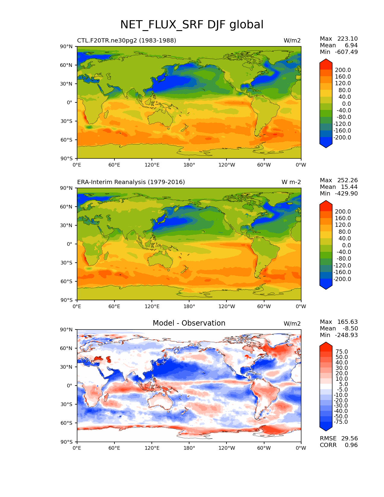 Use this command to recreate this image: | e3sm_diags lat_lon --no_viewer --case_id 'ERA-Interim' --sets 'lat_lon' --run_type 'model_vs_obs' --variables 'NET_FLUX_SRF' --seasons 'DJF' --regions 'global' --regrid_tool 'esmf' --regrid_method 'conservative' --main_title 'NET_FLUX_SRF DJF global' --backend 'mpl' --output_format 'png' --canvas_size_w '1212' --canvas_size_h '1628' --figsize '8.5' '11.0' --dpi '150' --arrows --contour_levels '-200' '-160' '-120' '-80' '-40' '0' '40' '80' '120' '160' '200' --test_name 'CTL.F20TR.ne30pg2' --test_title ' ' --test_colormap 'cet_rainbow.rgb' --ref_name 'ERA-Interim' --reference_name 'ERA-Interim Reanalysis' --reference_colormap 'cet_rainbow.rgb' --diff_title 'Model - Observation' --diff_colormap 'diverging_bwr.rgb' --diff_levels '-75' '-50' '-40' '-30' '-20' '-10' '-5' '5' '10' '20' '30' '40' '50' '75' --num_workers '4' --granulate 'variables' 'seasons' 'plevs' 'regions' --selectors 'sets' 'seasons' --reference_data_path '/global/cfs/cdirs/e3sm/acme_diags/obs_for_e3sm_diags/climatology/' --test_data_path '/global/cscratch1/sd/xsongsio/E3SM_simulations/CTL.F20TR.ne30pg2/diag/clim_rgr/6yr/' --results_dir '/global/cfs/cdirs/e3sm/www/xsongsio/CTL.F20TR.ne30pg2/6yr' |