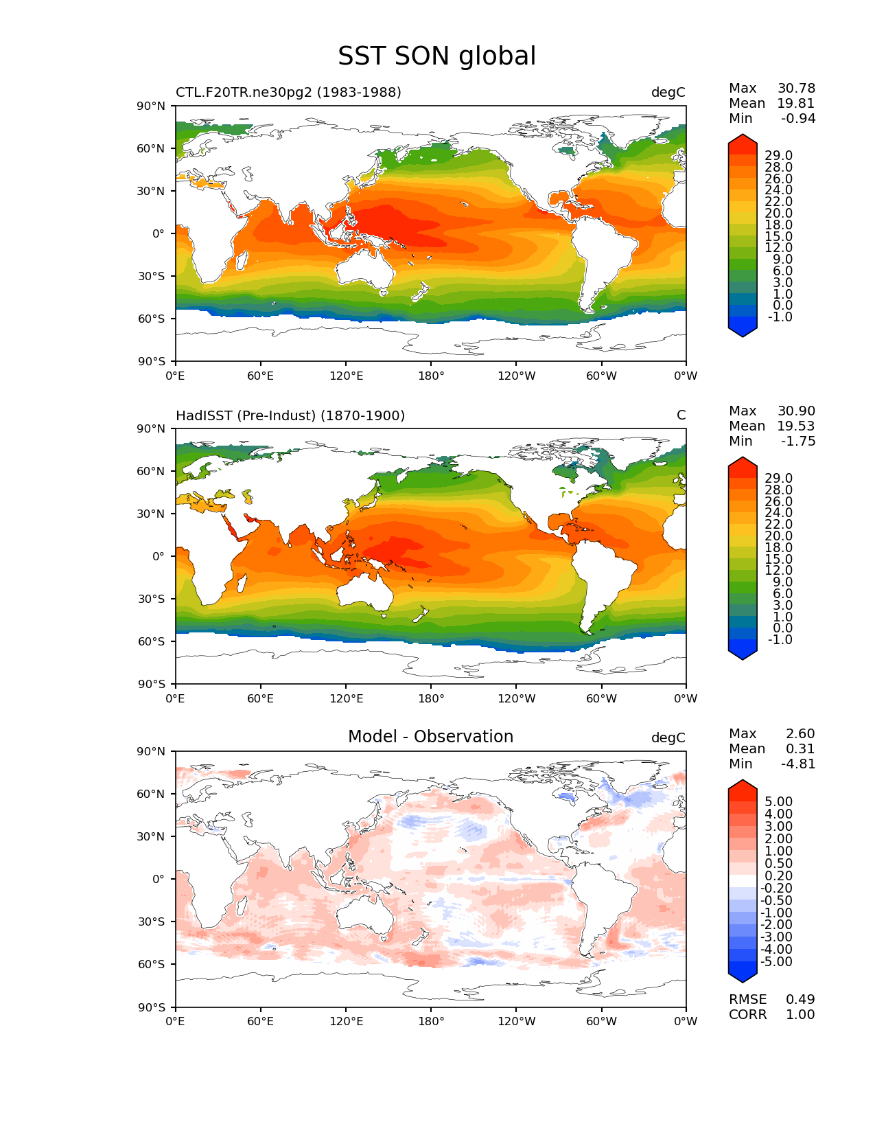 Use this command to recreate this image: | e3sm_diags lat_lon --no_viewer --case_id 'SST_PI_HadISST' --sets 'lat_lon' --run_type 'model_vs_obs' --variables 'SST' --seasons 'SON' --regions 'global' --regrid_tool 'esmf' --regrid_method 'conservative' --main_title 'SST SON global' --backend 'mpl' --output_format 'png' --canvas_size_w '1212' --canvas_size_h '1628' --figsize '8.5' '11.0' --dpi '150' --arrows --contour_levels '-1' '0' '1' '3' '6' '9' '12' '15' '18' '20' '22' '24' '26' '28' '29' --test_name 'CTL.F20TR.ne30pg2' --test_title ' ' --test_colormap 'cet_rainbow.rgb' --ref_name 'HadISST_PI' --reference_name 'HadISST (Pre-Indust)' --reference_colormap 'cet_rainbow.rgb' --diff_title 'Model - Observation' --diff_colormap 'diverging_bwr.rgb' --diff_levels '-5' '-4' '-3' '-2' '-1' '-0.5' '-0.2' '0.2' '0.5' '1' '2' '3' '4' '5' --num_workers '4' --granulate 'variables' 'seasons' 'plevs' 'regions' --selectors 'sets' 'seasons' --reference_data_path '/global/cfs/cdirs/e3sm/acme_diags/obs_for_e3sm_diags/climatology/' --test_data_path '/global/cscratch1/sd/xsongsio/E3SM_simulations/CTL.F20TR.ne30pg2/diag/clim_rgr/6yr/' --results_dir '/global/cfs/cdirs/e3sm/www/xsongsio/CTL.F20TR.ne30pg2/6yr' |