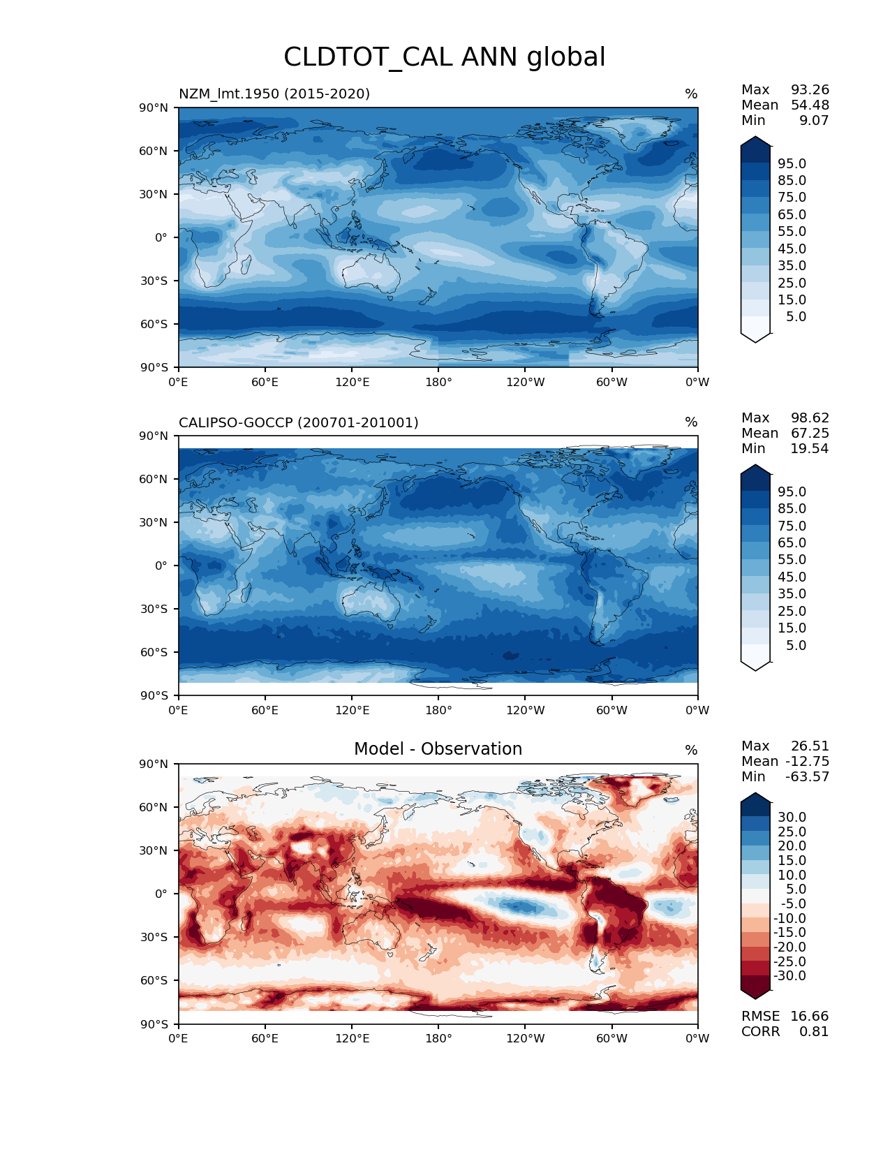Use this command to recreate this image: | e3sm_diags lat_lon --no_viewer --case_id 'Cloud Calipso' --sets 'lat_lon' --run_type 'model_vs_obs' --variables 'CLDTOT_CAL' --seasons 'ANN' --regions 'global' --regrid_tool 'esmf' --regrid_method 'conservative' --main_title 'CLDTOT_CAL ANN global' --backend 'mpl' --output_format 'png' --canvas_size_w '1212' --canvas_size_h '1628' --figsize '8.5' '11.0' --dpi '150' --arrows --contour_levels '5' '15' '25' '35' '45' '55' '65' '75' '85' '95' --test_name 'NZM_lmt.1950' --test_title ' ' --test_colormap 'Blues' --ref_name 'CALIPSOCOSP' --reference_name 'CALIPSO-GOCCP' --reference_colormap 'Blues' --diff_title 'Model - Observation' --diff_colormap 'RdBu' --diff_levels '-30' '-25' '-20' '-15' '-10' '-5' '5' '10' '15' '20' '25' '30' --num_workers '4' --granulate 'variables' 'seasons' 'plevs' 'regions' --selectors 'sets' 'seasons' --reference_data_path '/global/cfs/cdirs/e3sm/acme_diags/obs_for_e3sm_diags/climatology/' --test_data_path '/global/cscratch1/sd/xsongsio/E3SM_simulations/NZM_lmt.1950/diag/clim_rgr/6yr/' --results_dir '/global/cfs/cdirs/e3sm/www/xsongsio/NZM_lmt.1950/6yr' |
