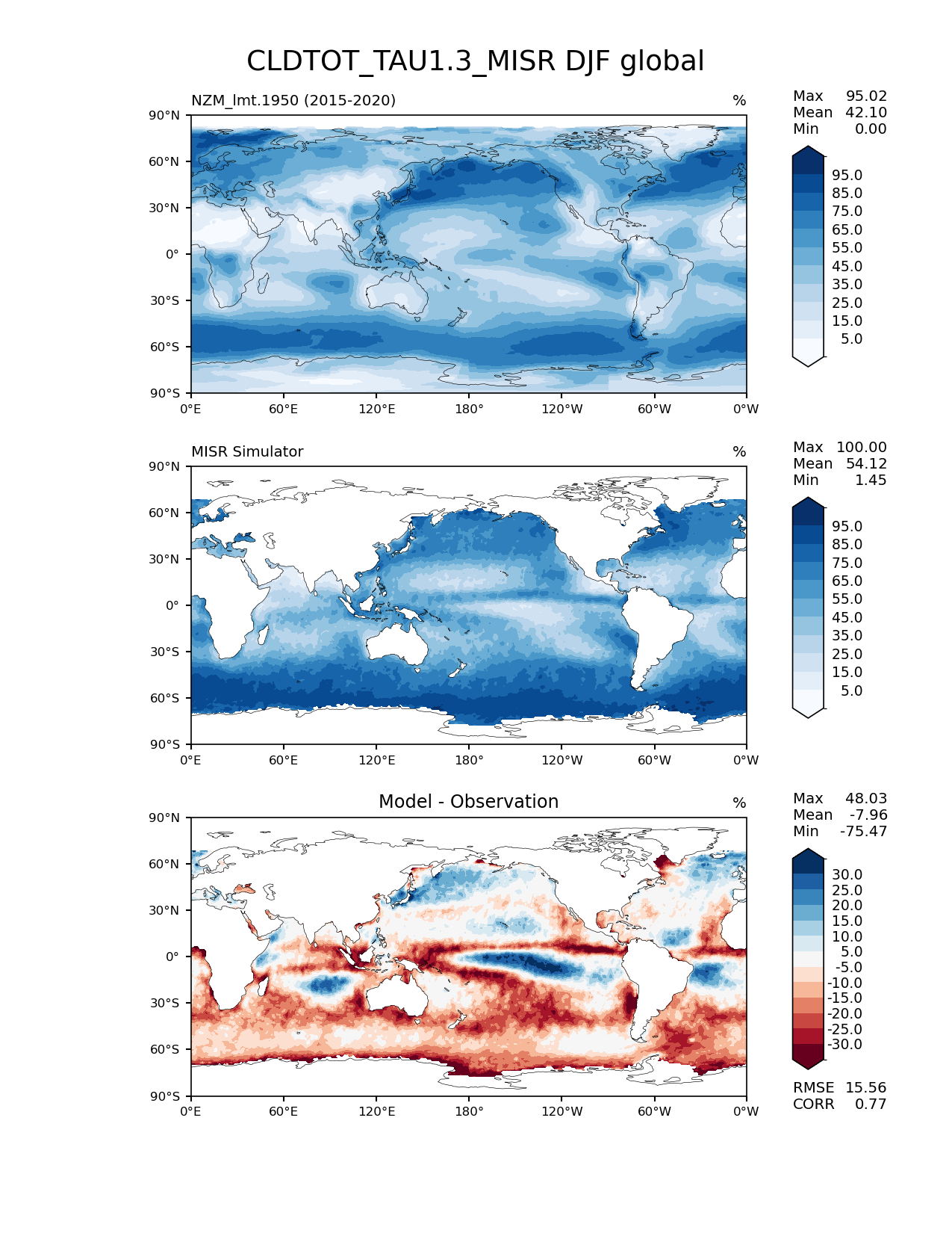 Use this command to recreate this image: | e3sm_diags lat_lon --no_viewer --case_id 'Cloud MISR' --sets 'lat_lon' --run_type 'model_vs_obs' --variables 'CLDTOT_TAU1.3_MISR' --seasons 'DJF' --regions 'global' --regrid_tool 'esmf' --regrid_method 'conservative' --main_title 'CLDTOT_TAU1.3_MISR DJF global' --backend 'mpl' --output_format 'png' --canvas_size_w '1212' --canvas_size_h '1628' --figsize '8.5' '11.0' --dpi '150' --arrows --contour_levels '5' '15' '25' '35' '45' '55' '65' '75' '85' '95' --test_name 'NZM_lmt.1950' --test_title ' ' --test_colormap 'Blues' --ref_name 'MISRCOSP' --reference_name 'MISR Simulator' --reference_colormap 'Blues' --diff_title 'Model - Observation' --diff_colormap 'RdBu' --diff_levels '-30' '-25' '-20' '-15' '-10' '-5' '5' '10' '15' '20' '25' '30' --num_workers '4' --granulate 'variables' 'seasons' 'plevs' 'regions' --selectors 'sets' 'seasons' --reference_data_path '/global/cfs/cdirs/e3sm/acme_diags/obs_for_e3sm_diags/climatology/' --test_data_path '/global/cscratch1/sd/xsongsio/E3SM_simulations/NZM_lmt.1950/diag/clim_rgr/6yr/' --results_dir '/global/cfs/cdirs/e3sm/www/xsongsio/NZM_lmt.1950/6yr' |