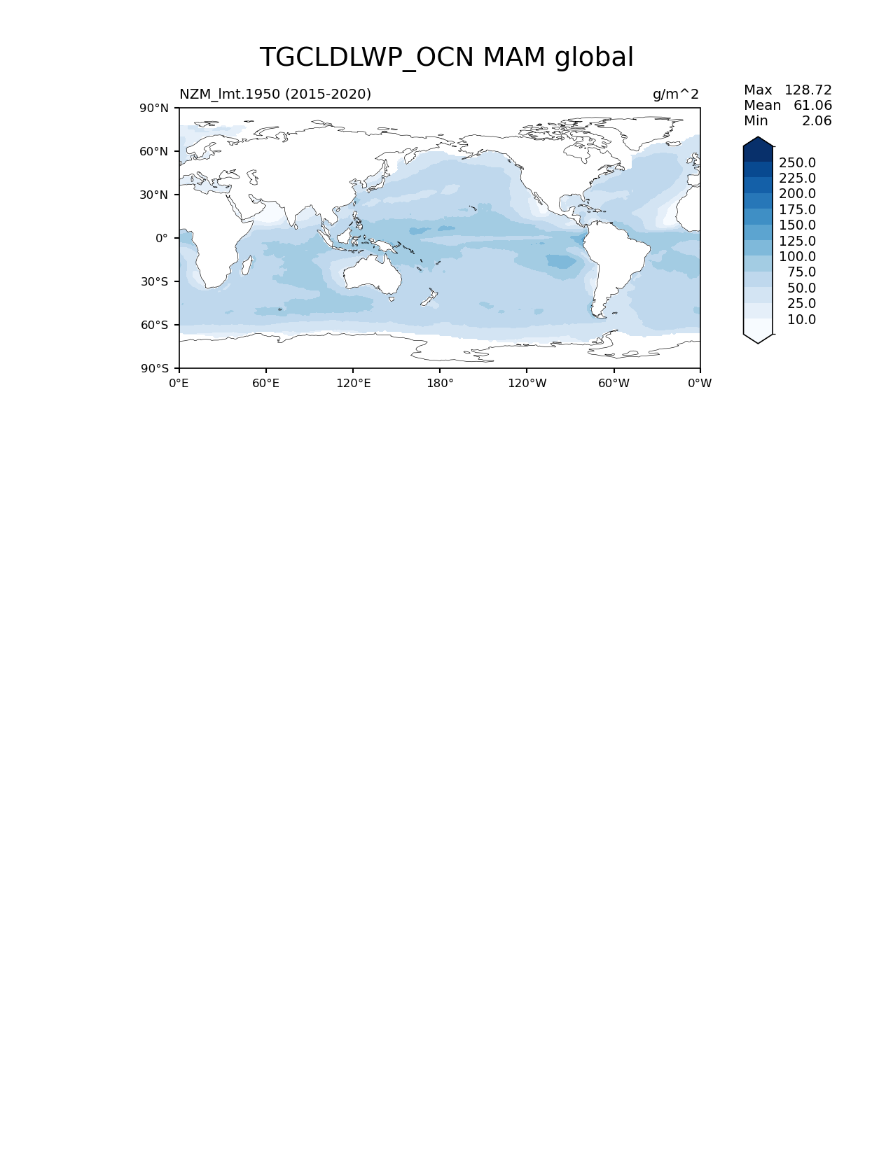 Use this command to recreate this image: | e3sm_diags lat_lon --no_viewer --case_id 'Cloud SSM/I' --sets 'lat_lon' --run_type 'model_vs_obs' --variables 'TGCLDLWP_OCN' --seasons 'MAM' --regions 'global' --regrid_tool 'esmf' --regrid_method 'bilinear' --main_title 'TGCLDLWP_OCN MAM global' --backend 'mpl' --output_format 'png' --canvas_size_w '1212' --canvas_size_h '1628' --figsize '8.5' '11.0' --dpi '150' --arrows --contour_levels '10' '25' '50' '75' '100' '125' '150' '175' '200' '225' '250' --test_name 'NZM_lmt.1950' --test_title ' ' --test_colormap 'Blues' --ref_name 'SSMI' --reference_name 'SSM/I (Wentz)' --reference_colormap 'Blues' --diff_title 'Model - Observation' --diff_colormap 'RdBu' --diff_levels '-80' '-60' '-50' '-40' '-30' '-20' '-10' '10' '20' '30' '40' '50' '60' '80' --num_workers '4' --granulate 'variables' 'seasons' 'plevs' 'regions' --selectors 'sets' 'seasons' --reference_data_path '/global/cfs/cdirs/e3sm/acme_diags/obs_for_e3sm_diags/climatology/' --test_data_path '/global/cscratch1/sd/xsongsio/E3SM_simulations/NZM_lmt.1950/diag/clim_rgr/6yr/' --results_dir '/global/cfs/cdirs/e3sm/www/xsongsio/NZM_lmt.1950/6yr' |