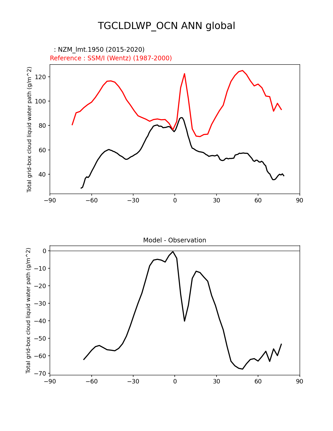 Use this command to recreate this image: | e3sm_diags zonal_mean_xy --no_viewer --case_id 'Cloud SSM/I' --sets 'zonal_mean_xy' --run_type 'model_vs_obs' --variables 'TGCLDLWP_OCN' --seasons 'ANN' --regions 'global' --regrid_tool 'esmf' --regrid_method 'conservative' --main_title 'TGCLDLWP_OCN ANN global' --backend 'mpl' --output_format 'png' --canvas_size_w '1212' --canvas_size_h '1628' --figsize '8.5' '11.0' --dpi '150' --arrows --test_name 'NZM_lmt.1950' --test_title ' ' --test_colormap 'cet_rainbow.rgb' --ref_name 'SSMI' --reference_name 'SSM/I (Wentz)' --reference_colormap 'cet_rainbow.rgb' --diff_title 'Model - Observation' --diff_colormap 'diverging_bwr.rgb' --num_workers '4' --granulate 'variables' 'seasons' 'plevs' 'regions' --selectors 'sets' 'seasons' --reference_data_path '/global/cfs/cdirs/e3sm/acme_diags/obs_for_e3sm_diags/climatology/' --test_data_path '/global/cscratch1/sd/xsongsio/E3SM_simulations/NZM_lmt.1950/diag/clim_rgr/6yr/' --results_dir '/global/cfs/cdirs/e3sm/www/xsongsio/NZM_lmt.1950/6yr' |