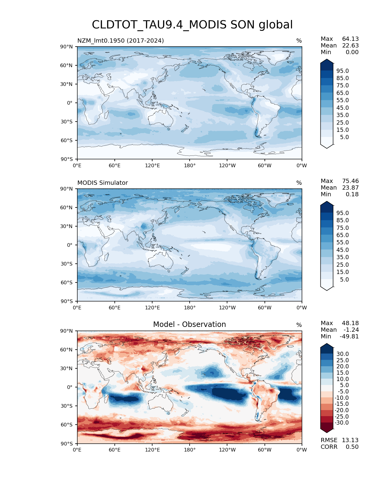 Use this command to recreate this image: | e3sm_diags lat_lon --no_viewer --reference_data_path '/global/cfs/cdirs/e3sm/acme_diags/obs_for_e3sm_diags/climatology/' --test_data_path '/pscratch/sd/x/xsongsio/DATA/NZM_lmt0.1950/diag/clim_rgr/' --results_dir '/global/cfs/cdirs/e3sm/www/xsongsio/NZM_lmt0.1950/8yr' --case_id 'Cloud MODIS' --run_type 'model_vs_obs' --sets 'lat_lon' --variables 'CLDTOT_TAU9.4_MODIS' --seasons 'SON' --regions 'global' --regrid_tool 'esmf' --regrid_method 'conservative' --multiprocessing --num_workers '32' --main_title 'CLDTOT_TAU9.4_MODIS SON global' --backend 'mpl' --output_format 'png' --canvas_size_w '1212' --canvas_size_h '1628' --figsize '8.5' '11.0' --dpi '150' --arrows --contour_levels '5' '15' '25' '35' '45' '55' '65' '75' '85' '95' --test_name 'NZM_lmt0.1950' --test_title ' ' --test_colormap 'Blues' --ref_name 'MODISCOSP' --reference_name 'MODIS Simulator' --reference_colormap 'Blues' --diff_title 'Model - Observation' --diff_colormap 'RdBu' --diff_levels '-30' '-25' '-20' '-15' '-10' '-5' '5' '10' '15' '20' '25' '30' --granulate 'variables' 'seasons' 'plevs' 'regions' --selectors 'sets' 'seasons' |