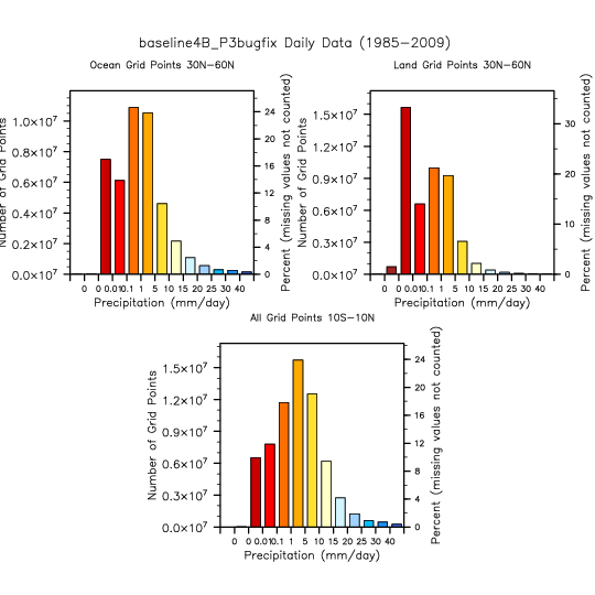 Histograms of daily precipitation rate for the Tropics and NH Extratropics.