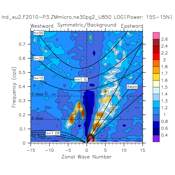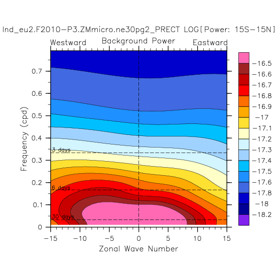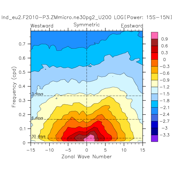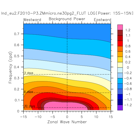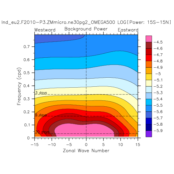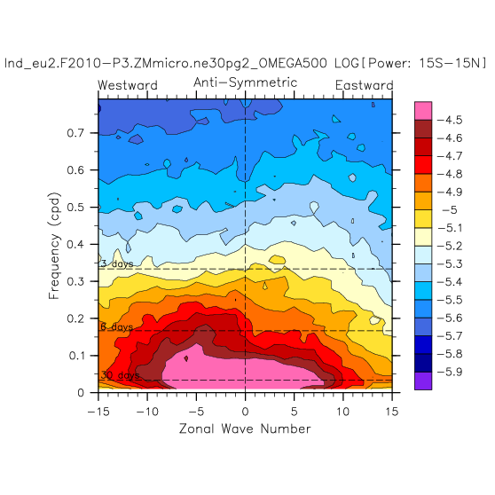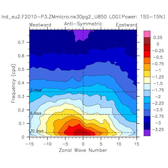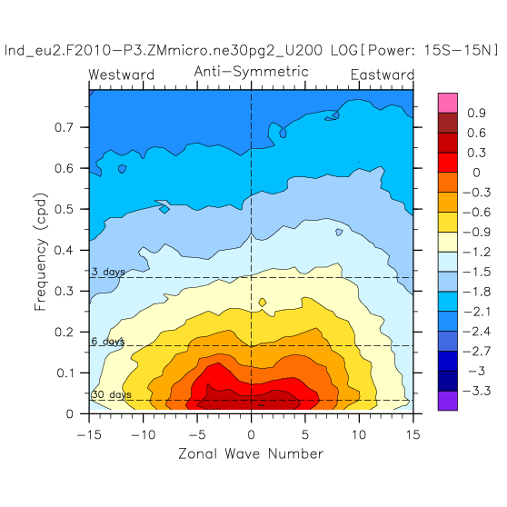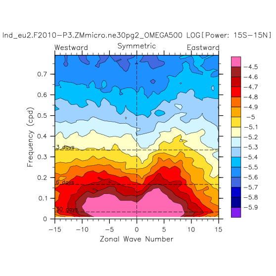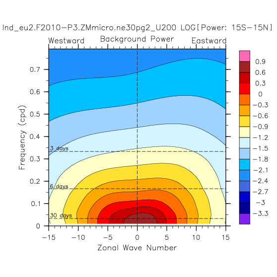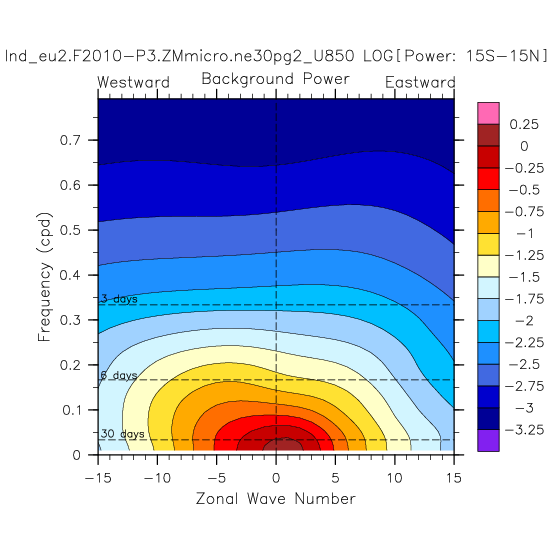 Zonal wavenumber-frequency logarithm of power spectra calculated from 06Z and