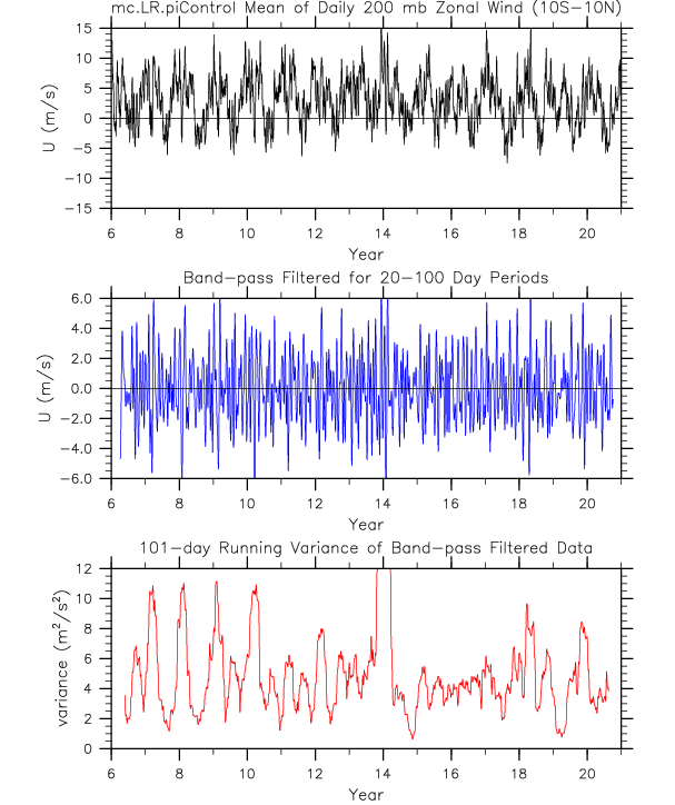 Time series of daily 200 hPa zonal wind averaged over 10N-10S.