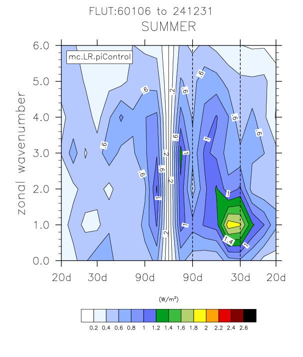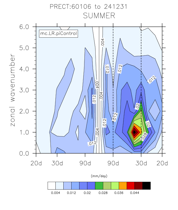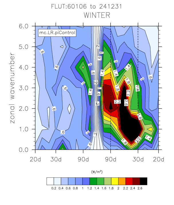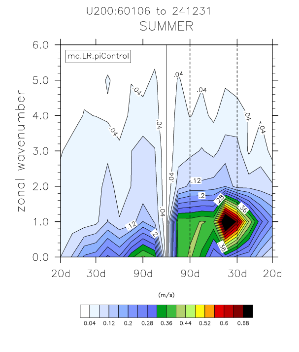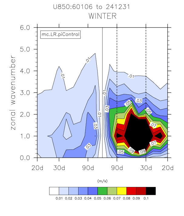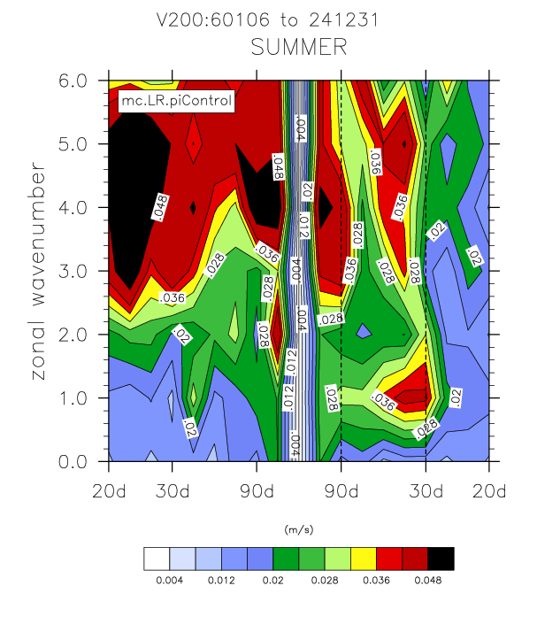 The wavenumber - frequency spectra plots (mc.LR.piControl vs obs)
