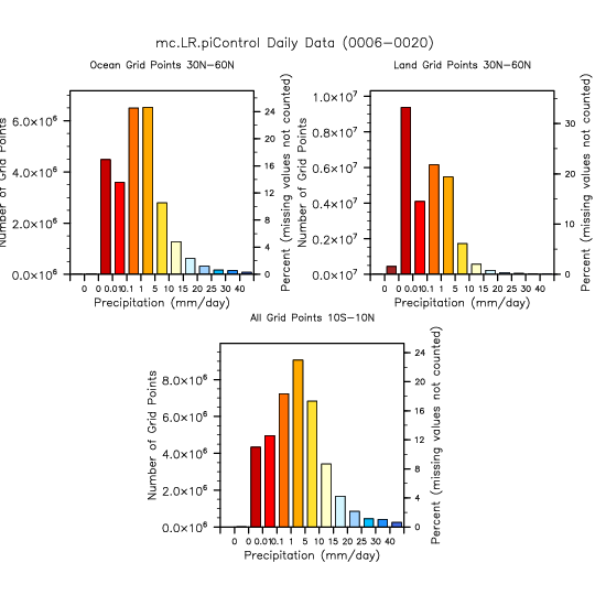 Histograms of daily precipitation rate for the Tropics and NH Extratropics.