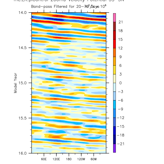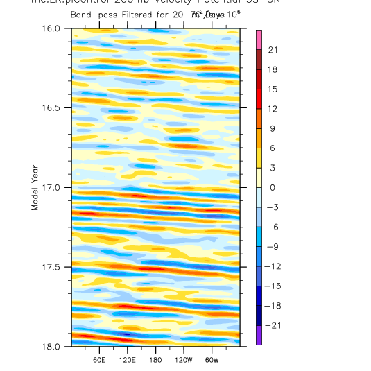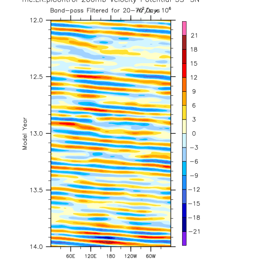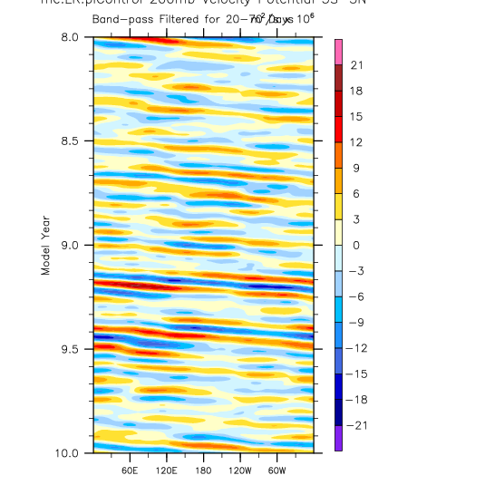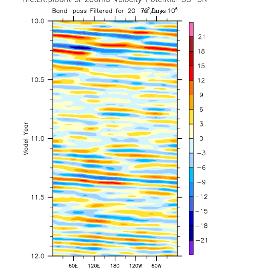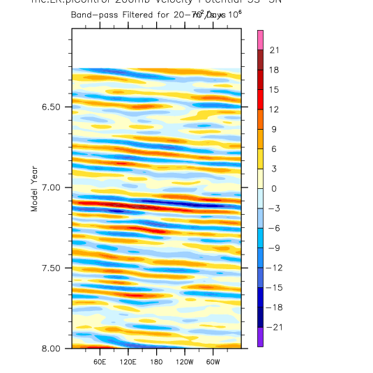 over 5S-5N, 20-70 day bandpass filter then applied. Hovmöller plots.