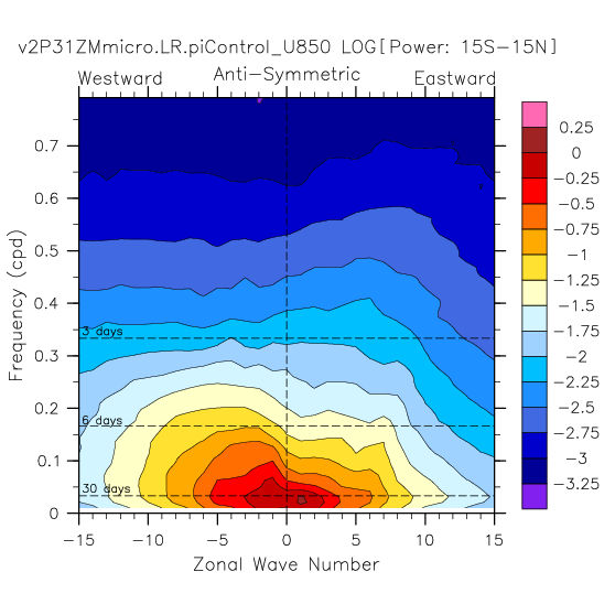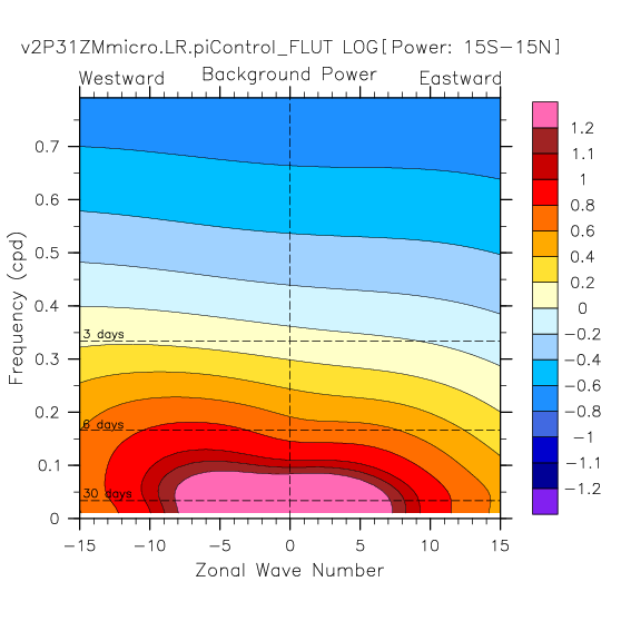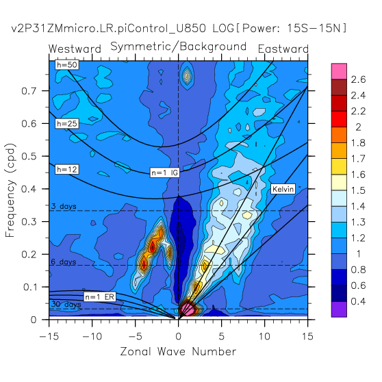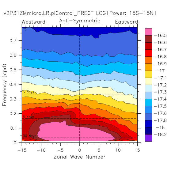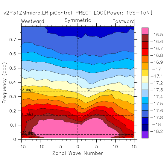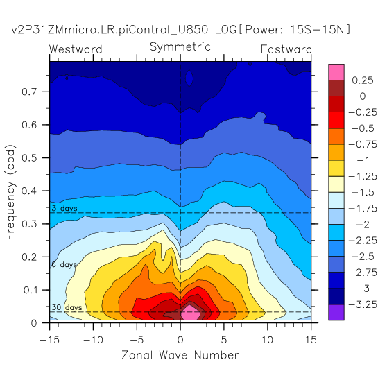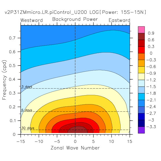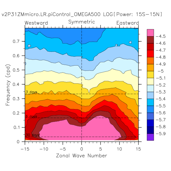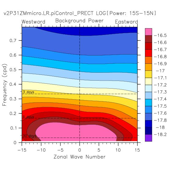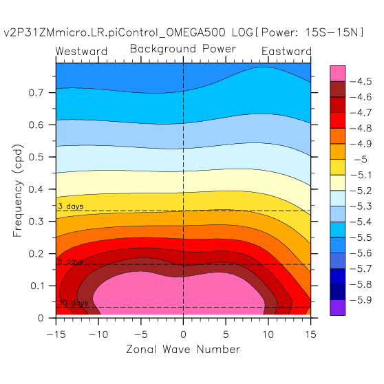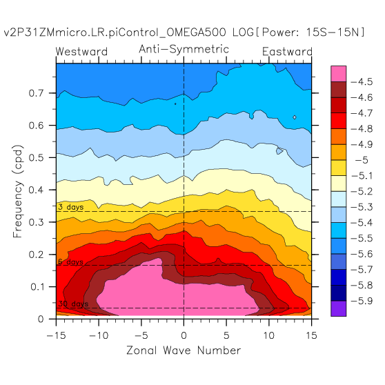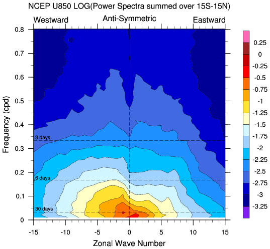 Zonal wavenumber-frequency logarithm of power spectra calculated from 06Z and