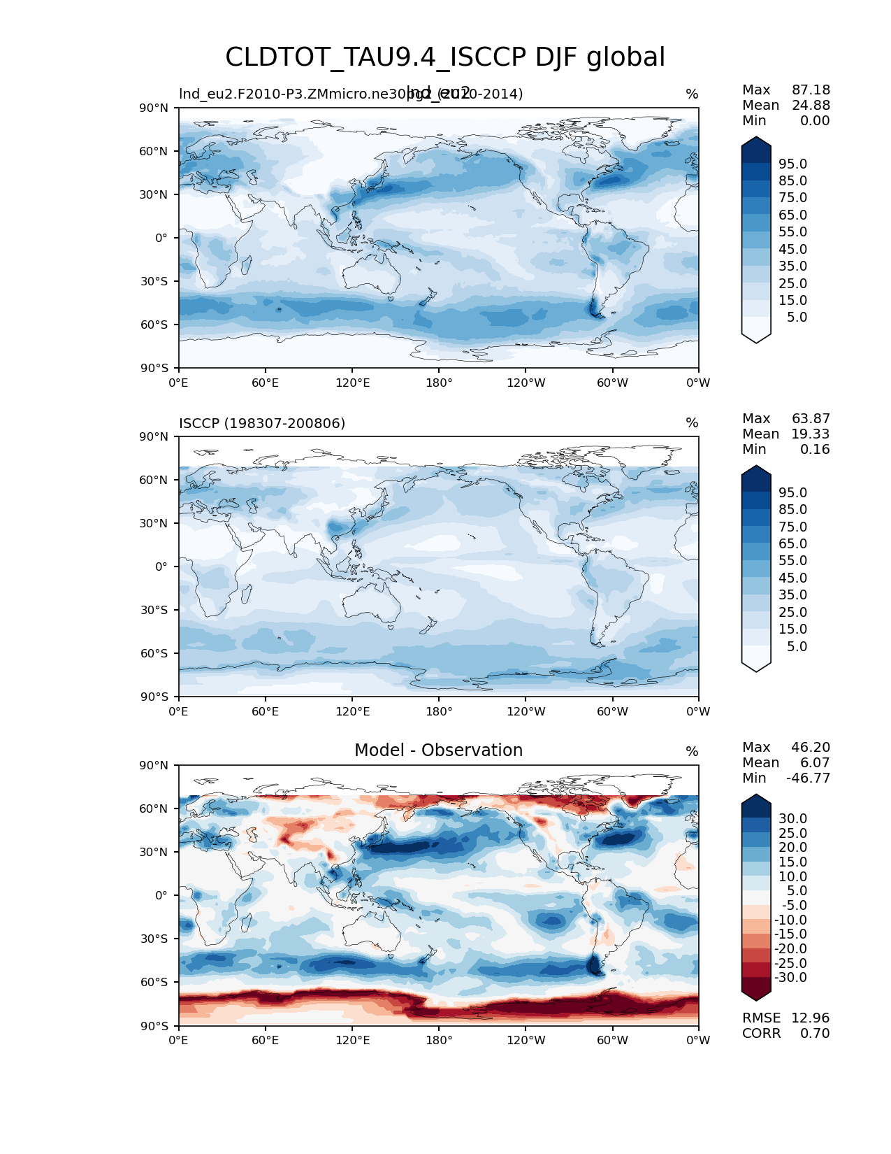 Use this command to recreate this image: | e3sm_diags lat_lon --no_viewer --case_id 'Cloud ISCCP' --sets 'lat_lon' --run_type 'model_vs_obs' --variables 'CLDTOT_TAU9.4_ISCCP' --seasons 'DJF' --regions 'global' --regrid_tool 'esmf' --regrid_method 'conservative' --main_title 'CLDTOT_TAU9.4_ISCCP DJF global' --backend 'mpl' --output_format 'png' --canvas_size_w '1212' --canvas_size_h '1628' --figsize '8.5' '11.0' --dpi '150' --arrows --contour_levels '5' '15' '25' '35' '45' '55' '65' '75' '85' '95' --test_name 'lnd_eu2.F2010-P3.ZMmicro.ne30pg2' --test_title 'lnd_eu2' --test_colormap 'Blues' --ref_name 'ISCCPCOSP' --reference_name 'ISCCP' --reference_colormap 'Blues' --diff_title 'Model - Observation' --diff_colormap 'RdBu' --diff_levels '-30' '-25' '-20' '-15' '-10' '-5' '5' '10' '15' '20' '25' '30' --num_workers '4' --granulate 'variables' 'seasons' 'plevs' 'regions' --selectors 'sets' 'seasons' --reference_data_path '/global/cfs/cdirs/e3sm/acme_diags/obs_for_e3sm_diags/climatology/' --test_data_path '/global/cscratch1/sd/xsongsio/E3SM_simulations/lnd_eu2.F2010-P3.ZMmicro.ne30pg2/diag/clim_rgr/5yr/' --results_dir '/global/cfs/cdirs/e3sm/www/xsongsio/lnd_eu2.F2010-P3.ZMmicro.ne30pg2/5yr' |