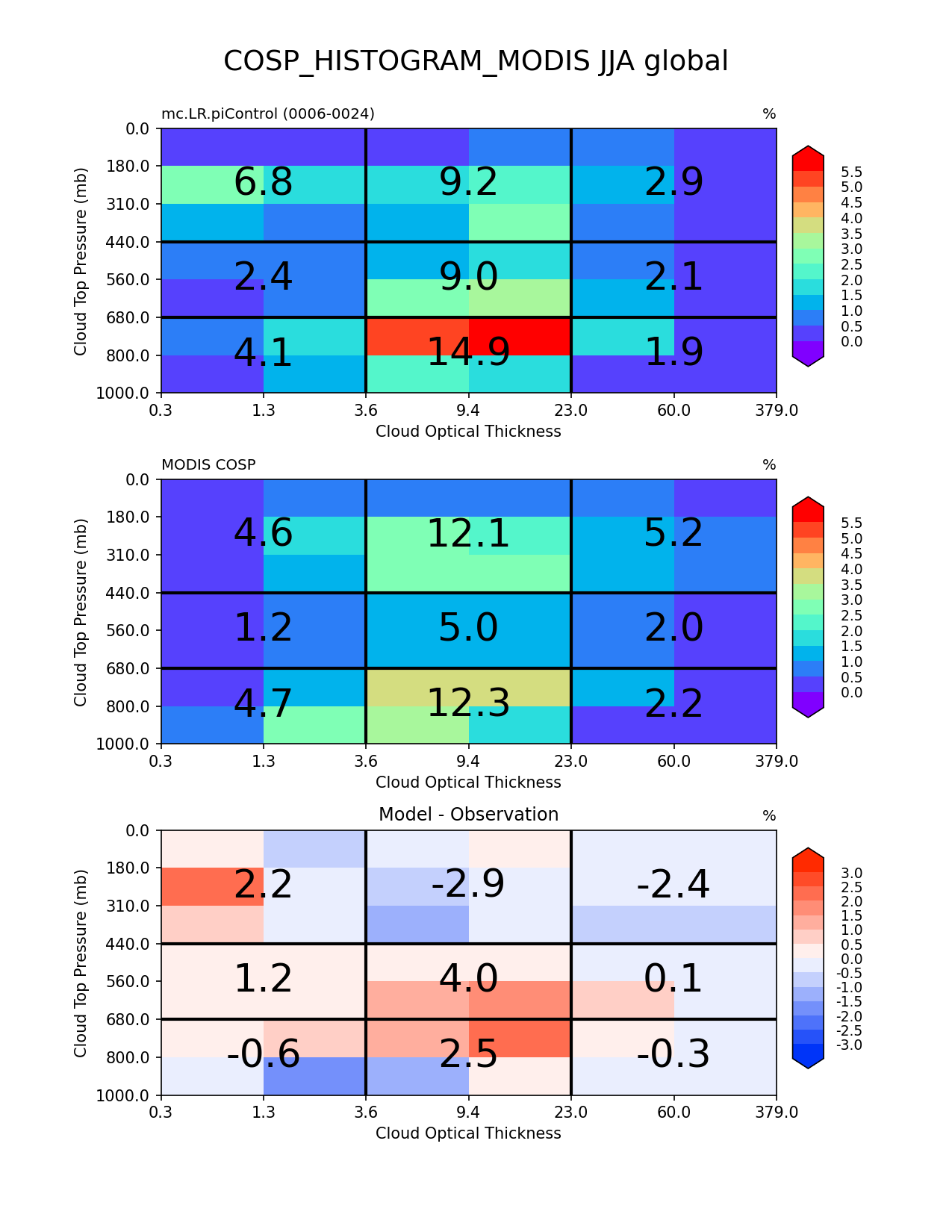 Use this command to recreate this image: | e3sm_diags cosp_histogram --no_viewer --case_id 'MODIS-COSP' --sets 'cosp_histogram' --run_type 'model_vs_obs' --variables 'COSP_HISTOGRAM_MODIS' --seasons 'JJA' --regions 'global' --regrid_tool 'esmf' --regrid_method 'conservative' --main_title 'COSP_HISTOGRAM_MODIS JJA global' --backend 'mpl' --output_format 'png' --canvas_size_w '1212' --canvas_size_h '1628' --figsize '8.5' '11.0' --dpi '150' --arrows --contour_levels '0' '0.5' '1.0' '1.5' '2.0' '2.5' '3.0' '3.5' '4.0' '4.5' '5.0' '5.5' --test_name 'mc.LR.piControl' --test_title ' ' --test_colormap 'cet_rainbow.rgb' --ref_name 'MODISCOSP' --reference_name 'MODIS COSP' --reference_colormap 'cet_rainbow.rgb' --diff_title 'Model - Observation' --diff_colormap 'diverging_bwr.rgb' --diff_levels '-3.0' '-2.5' '-2.0' '-1.5' '-1.0' '-0.5' '0' '0.5' '1.0' '1.5' '2.0' '2.5' '3.0' --num_workers '4' --granulate 'variables' 'seasons' 'plevs' 'regions' --selectors 'sets' 'seasons' --reference_data_path '/global/cfs/cdirs/e3sm/acme_diags/obs_for_e3sm_diags/climatology/' --test_data_path '/global/cscratch1/sd/xsongsio/E3SM_simulations/mc.LR.piControl/diag/clim_rgr/19yr/' --results_dir '/global/cfs/cdirs/e3sm/www/xsongsio/mc.LR.piControl/19yr' |