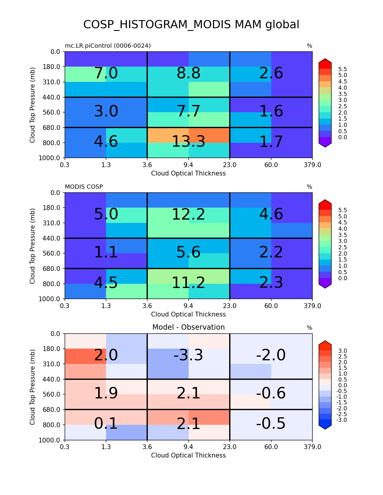 Use this command to recreate this image: | e3sm_diags cosp_histogram --no_viewer --case_id 'MODIS-COSP' --sets 'cosp_histogram' --run_type 'model_vs_obs' --variables 'COSP_HISTOGRAM_MODIS' --seasons 'MAM' --regions 'global' --regrid_tool 'esmf' --regrid_method 'conservative' --main_title 'COSP_HISTOGRAM_MODIS MAM global' --backend 'mpl' --output_format 'png' --canvas_size_w '1212' --canvas_size_h '1628' --figsize '8.5' '11.0' --dpi '150' --arrows --contour_levels '0' '0.5' '1.0' '1.5' '2.0' '2.5' '3.0' '3.5' '4.0' '4.5' '5.0' '5.5' --test_name 'mc.LR.piControl' --test_title ' ' --test_colormap 'cet_rainbow.rgb' --ref_name 'MODISCOSP' --reference_name 'MODIS COSP' --reference_colormap 'cet_rainbow.rgb' --diff_title 'Model - Observation' --diff_colormap 'diverging_bwr.rgb' --diff_levels '-3.0' '-2.5' '-2.0' '-1.5' '-1.0' '-0.5' '0' '0.5' '1.0' '1.5' '2.0' '2.5' '3.0' --num_workers '4' --granulate 'variables' 'seasons' 'plevs' 'regions' --selectors 'sets' 'seasons' --reference_data_path '/global/cfs/cdirs/e3sm/acme_diags/obs_for_e3sm_diags/climatology/' --test_data_path '/global/cscratch1/sd/xsongsio/E3SM_simulations/mc.LR.piControl/diag/clim_rgr/19yr/' --results_dir '/global/cfs/cdirs/e3sm/www/xsongsio/mc.LR.piControl/19yr' |