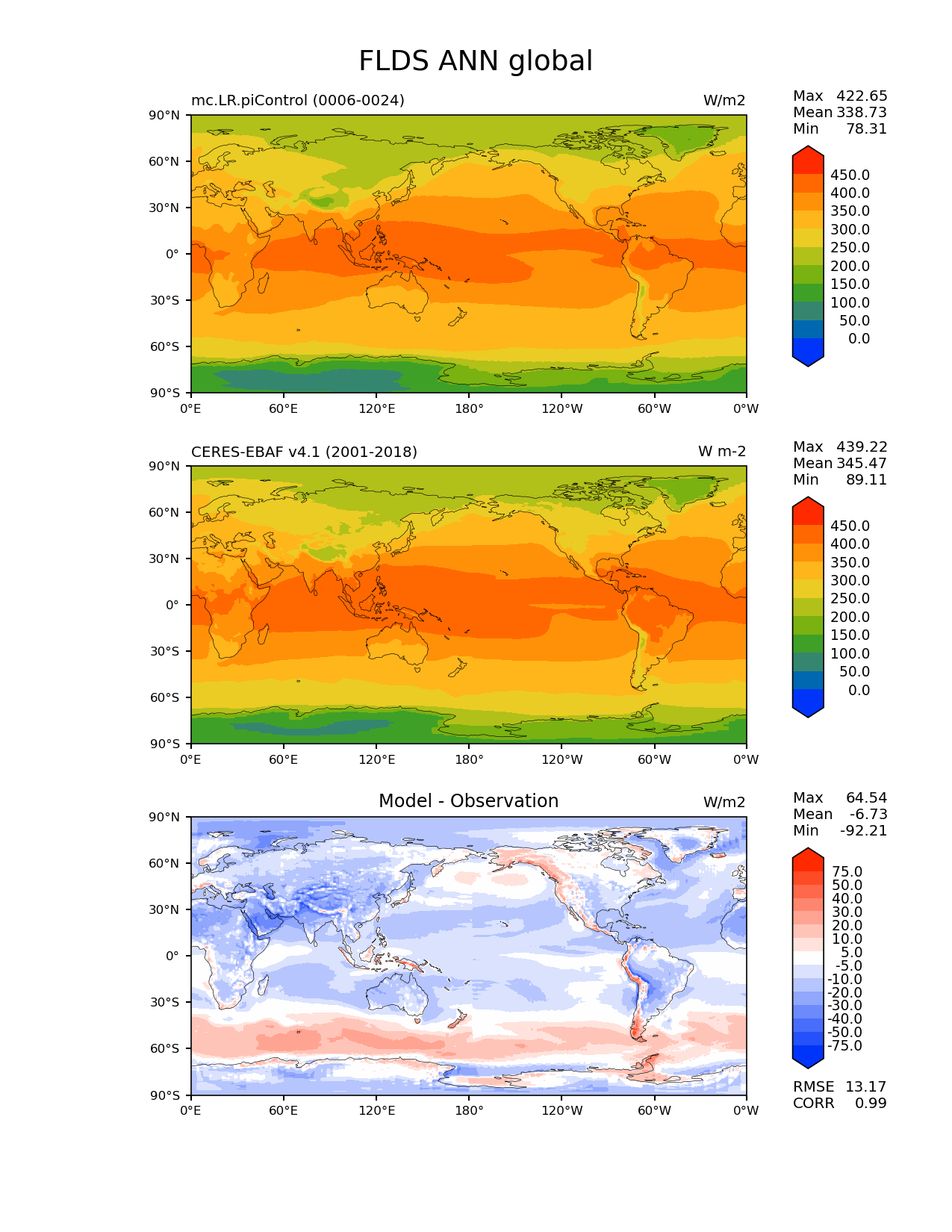 Use this command to recreate this image: | e3sm_diags lat_lon --no_viewer --case_id 'CERES-EBAF-surface-v4.1' --sets 'lat_lon' --run_type 'model_vs_obs' --variables 'FLDS' --seasons 'ANN' --regions 'global' --regrid_tool 'esmf' --regrid_method 'conservative' --main_title 'FLDS ANN global' --backend 'mpl' --output_format 'png' --canvas_size_w '1212' --canvas_size_h '1628' --figsize '8.5' '11.0' --dpi '150' --arrows --contour_levels '0' '50' '100' '150' '200' '250' '300' '350' '400' '450' --test_name 'mc.LR.piControl' --test_title ' ' --test_colormap 'cet_rainbow.rgb' --ref_name 'ceres_ebaf_surface_v4.1' --reference_name 'CERES-EBAF v4.1' --reference_colormap 'cet_rainbow.rgb' --diff_title 'Model - Observation' --diff_colormap 'diverging_bwr.rgb' --diff_levels '-75' '-50' '-40' '-30' '-20' '-10' '-5' '5' '10' '20' '30' '40' '50' '75' --num_workers '4' --granulate 'variables' 'seasons' 'plevs' 'regions' --selectors 'sets' 'seasons' --reference_data_path '/global/cfs/cdirs/e3sm/acme_diags/obs_for_e3sm_diags/climatology/' --test_data_path '/global/cscratch1/sd/xsongsio/E3SM_simulations/mc.LR.piControl/diag/clim_rgr/19yr/' --results_dir '/global/cfs/cdirs/e3sm/www/xsongsio/mc.LR.piControl/19yr' |