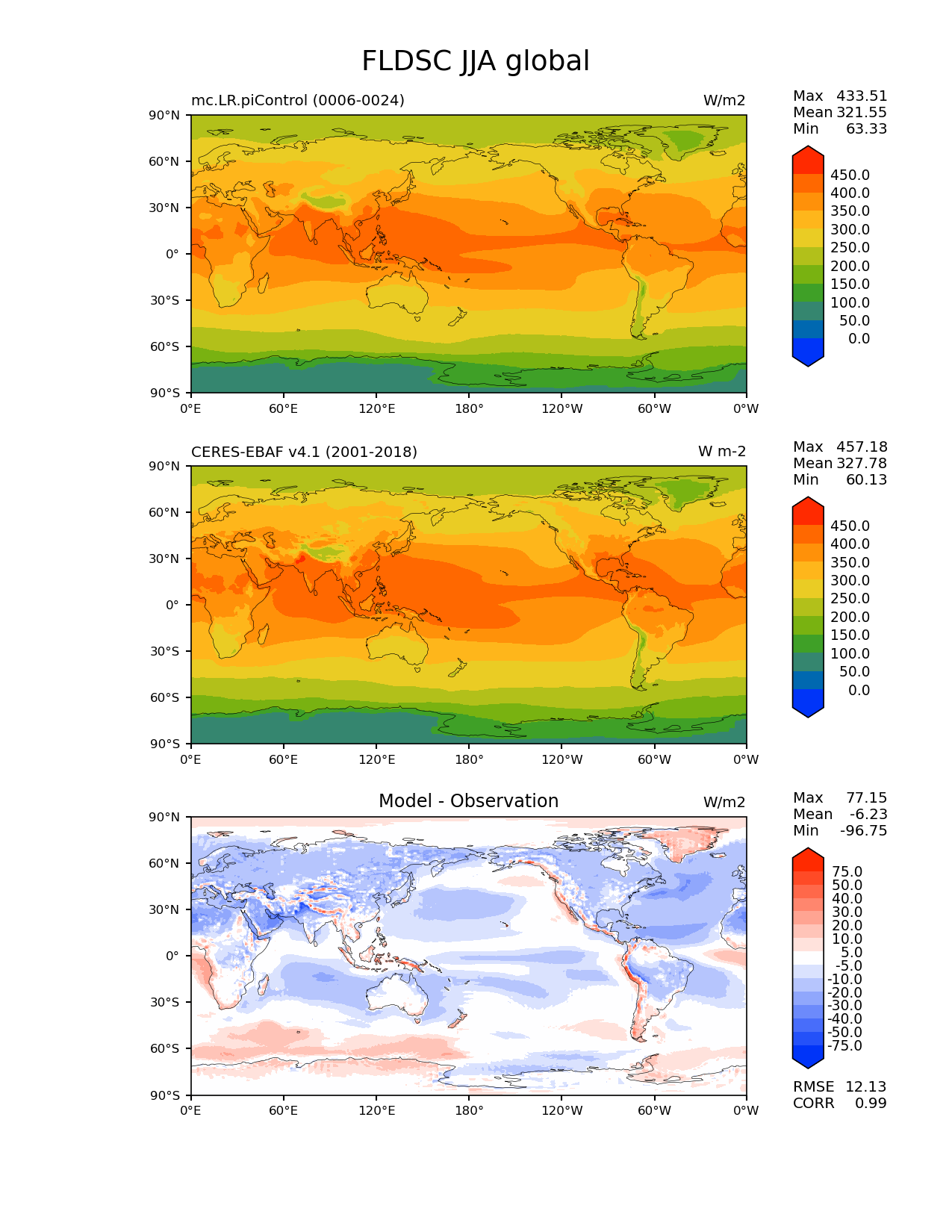 Use this command to recreate this image: | e3sm_diags lat_lon --no_viewer --case_id 'CERES-EBAF-surface-v4.1' --sets 'lat_lon' --run_type 'model_vs_obs' --variables 'FLDSC' --seasons 'JJA' --regions 'global' --regrid_tool 'esmf' --regrid_method 'conservative' --main_title 'FLDSC JJA global' --backend 'mpl' --output_format 'png' --canvas_size_w '1212' --canvas_size_h '1628' --figsize '8.5' '11.0' --dpi '150' --arrows --contour_levels '0' '50' '100' '150' '200' '250' '300' '350' '400' '450' --test_name 'mc.LR.piControl' --test_title ' ' --test_colormap 'cet_rainbow.rgb' --ref_name 'ceres_ebaf_surface_v4.1' --reference_name 'CERES-EBAF v4.1' --reference_colormap 'cet_rainbow.rgb' --diff_title 'Model - Observation' --diff_colormap 'diverging_bwr.rgb' --diff_levels '-75' '-50' '-40' '-30' '-20' '-10' '-5' '5' '10' '20' '30' '40' '50' '75' --num_workers '4' --granulate 'variables' 'seasons' 'plevs' 'regions' --selectors 'sets' 'seasons' --reference_data_path '/global/cfs/cdirs/e3sm/acme_diags/obs_for_e3sm_diags/climatology/' --test_data_path '/global/cscratch1/sd/xsongsio/E3SM_simulations/mc.LR.piControl/diag/clim_rgr/19yr/' --results_dir '/global/cfs/cdirs/e3sm/www/xsongsio/mc.LR.piControl/19yr' |
