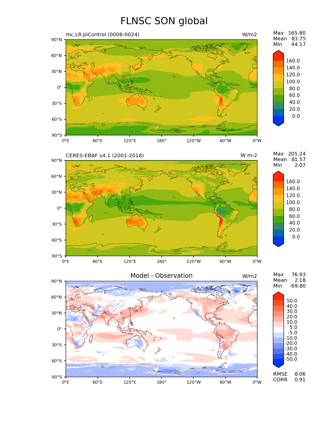 Use this command to recreate this image: | e3sm_diags lat_lon --no_viewer --case_id 'CERES-EBAF-surface-v4.1' --sets 'lat_lon' --run_type 'model_vs_obs' --variables 'FLNSC' --seasons 'SON' --regions 'global' --regrid_tool 'esmf' --regrid_method 'conservative' --main_title 'FLNSC SON global' --backend 'mpl' --output_format 'png' --canvas_size_w '1212' --canvas_size_h '1628' --figsize '8.5' '11.0' --dpi '150' --arrows --contour_levels '0' '20' '40' '60' '80' '100' '120' '140' '160' --test_name 'mc.LR.piControl' --test_title ' ' --test_colormap 'cet_rainbow.rgb' --ref_name 'ceres_ebaf_surface_v4.1' --reference_name 'CERES-EBAF v4.1' --reference_colormap 'cet_rainbow.rgb' --diff_title 'Model - Observation' --diff_colormap 'diverging_bwr.rgb' --diff_levels '-50' '-40' '-30' '-20' '-10' '-5' '5' '10' '20' '30' '40' '50' --num_workers '4' --granulate 'variables' 'seasons' 'plevs' 'regions' --selectors 'sets' 'seasons' --reference_data_path '/global/cfs/cdirs/e3sm/acme_diags/obs_for_e3sm_diags/climatology/' --test_data_path '/global/cscratch1/sd/xsongsio/E3SM_simulations/mc.LR.piControl/diag/clim_rgr/19yr/' --results_dir '/global/cfs/cdirs/e3sm/www/xsongsio/mc.LR.piControl/19yr' |