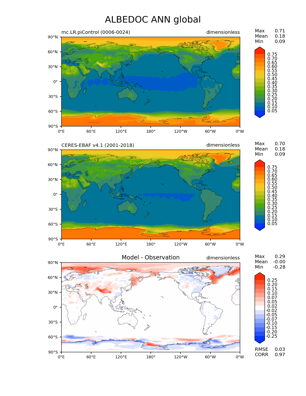 Use this command to recreate this image: | e3sm_diags lat_lon --no_viewer --case_id 'CERES-EBAF-TOA-v4.1' --sets 'lat_lon' --run_type 'model_vs_obs' --variables 'ALBEDOC' --seasons 'ANN' --regions 'global' --regrid_tool 'esmf' --regrid_method 'conservative' --main_title 'ALBEDOC ANN global' --backend 'mpl' --output_format 'png' --canvas_size_w '1212' --canvas_size_h '1628' --figsize '8.5' '11.0' --dpi '150' --arrows --contour_levels '0.05' '0.1' '0.15' '0.2' '0.25' '0.3' '0.35' '0.4' '0.45' '0.5' '0.55' '0.6' '0.65' '0.7' '0.75' --test_name 'mc.LR.piControl' --test_title ' ' --test_colormap 'cet_rainbow.rgb' --ref_name 'ceres_ebaf_toa_v4.1' --reference_name 'CERES-EBAF v4.1' --reference_colormap 'cet_rainbow.rgb' --diff_title 'Model - Observation' --diff_colormap 'diverging_bwr.rgb' --diff_levels '-0.25' '-0.2' '-0.15' '-0.1' '-0.07' '-0.05' '-0.02' '0.02' '0.05' '0.07' '0.1' '0.15' '0.2' '0.25' --num_workers '4' --granulate 'variables' 'seasons' 'plevs' 'regions' --selectors 'sets' 'seasons' --reference_data_path '/global/cfs/cdirs/e3sm/acme_diags/obs_for_e3sm_diags/climatology/' --test_data_path '/global/cscratch1/sd/xsongsio/E3SM_simulations/mc.LR.piControl/diag/clim_rgr/19yr/' --results_dir '/global/cfs/cdirs/e3sm/www/xsongsio/mc.LR.piControl/19yr' |