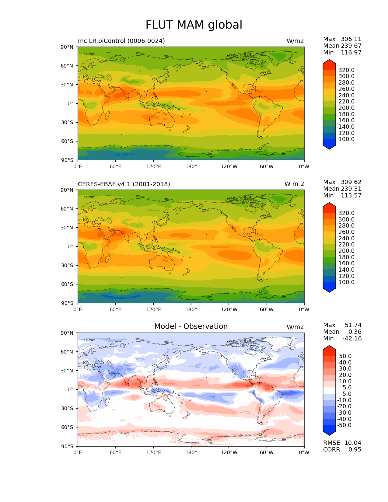 Use this command to recreate this image: | e3sm_diags lat_lon --no_viewer --case_id 'CERES-EBAF-TOA-v4.1' --sets 'lat_lon' --run_type 'model_vs_obs' --variables 'FLUT' --seasons 'MAM' --regions 'global' --regrid_tool 'esmf' --regrid_method 'conservative' --main_title 'FLUT MAM global' --backend 'mpl' --output_format 'png' --canvas_size_w '1212' --canvas_size_h '1628' --figsize '8.5' '11.0' --dpi '150' --arrows --contour_levels '100' '120' '140' '160' '180' '200' '220' '240' '260' '280' '300' '320' --test_name 'mc.LR.piControl' --test_title ' ' --test_colormap 'cet_rainbow.rgb' --ref_name 'ceres_ebaf_toa_v4.1' --reference_name 'CERES-EBAF v4.1' --reference_colormap 'cet_rainbow.rgb' --diff_title 'Model - Observation' --diff_colormap 'diverging_bwr.rgb' --diff_levels '-50' '-40' '-30' '-20' '-10' '-5' '5' '10' '20' '30' '40' '50' --num_workers '4' --granulate 'variables' 'seasons' 'plevs' 'regions' --selectors 'sets' 'seasons' --reference_data_path '/global/cfs/cdirs/e3sm/acme_diags/obs_for_e3sm_diags/climatology/' --test_data_path '/global/cscratch1/sd/xsongsio/E3SM_simulations/mc.LR.piControl/diag/clim_rgr/19yr/' --results_dir '/global/cfs/cdirs/e3sm/www/xsongsio/mc.LR.piControl/19yr' |