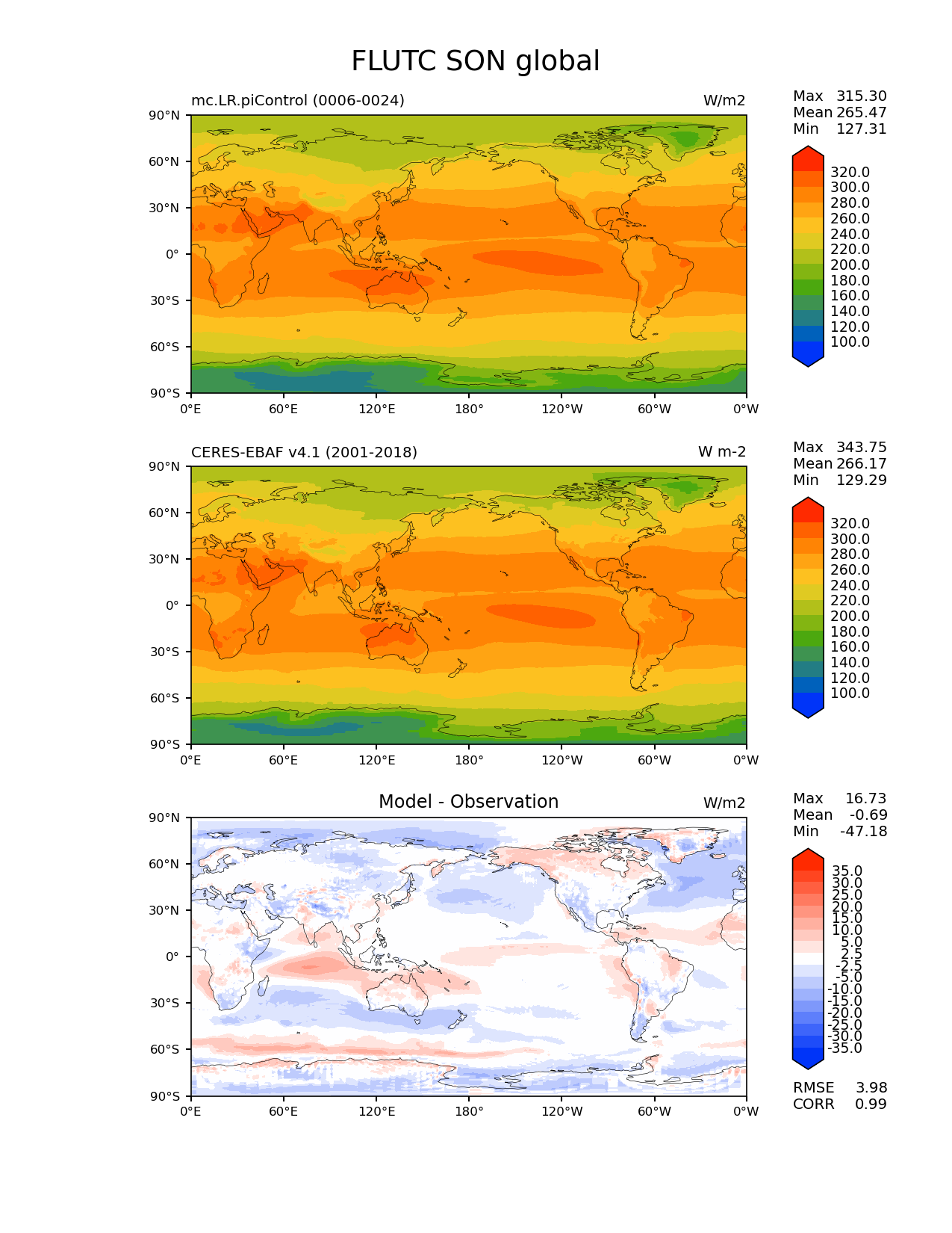 Use this command to recreate this image: | e3sm_diags lat_lon --no_viewer --case_id 'CERES-EBAF-TOA-v4.1' --sets 'lat_lon' --run_type 'model_vs_obs' --variables 'FLUTC' --seasons 'SON' --regions 'global' --regrid_tool 'esmf' --regrid_method 'conservative' --main_title 'FLUTC SON global' --backend 'mpl' --output_format 'png' --canvas_size_w '1212' --canvas_size_h '1628' --figsize '8.5' '11.0' --dpi '150' --arrows --contour_levels '100' '120' '140' '160' '180' '200' '220' '240' '260' '280' '300' '320' --test_name 'mc.LR.piControl' --test_title ' ' --test_colormap 'cet_rainbow.rgb' --ref_name 'ceres_ebaf_toa_v4.1' --reference_name 'CERES-EBAF v4.1' --reference_colormap 'cet_rainbow.rgb' --diff_title 'Model - Observation' --diff_colormap 'diverging_bwr.rgb' --diff_levels '-35' '-30' '-25' '-20' '-15' '-10' '-5' '-2.5' '2.5' '5' '10' '15' '20' '25' '30' '35' --num_workers '4' --granulate 'variables' 'seasons' 'plevs' 'regions' --selectors 'sets' 'seasons' --reference_data_path '/global/cfs/cdirs/e3sm/acme_diags/obs_for_e3sm_diags/climatology/' --test_data_path '/global/cscratch1/sd/xsongsio/E3SM_simulations/mc.LR.piControl/diag/clim_rgr/19yr/' --results_dir '/global/cfs/cdirs/e3sm/www/xsongsio/mc.LR.piControl/19yr' |