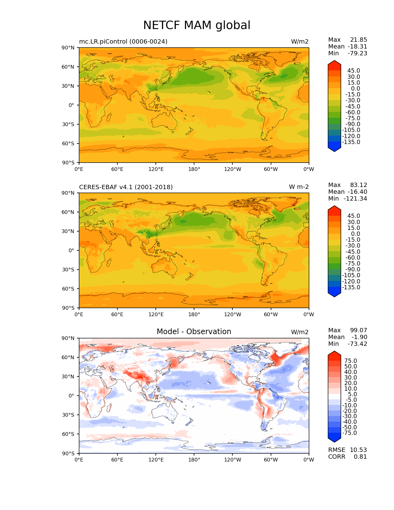 Use this command to recreate this image: | e3sm_diags lat_lon --no_viewer --case_id 'CERES-EBAF-TOA-v4.1' --sets 'lat_lon' --run_type 'model_vs_obs' --variables 'NETCF' --seasons 'MAM' --regions 'global' --regrid_tool 'esmf' --regrid_method 'conservative' --main_title 'NETCF MAM global' --backend 'mpl' --output_format 'png' --canvas_size_w '1212' --canvas_size_h '1628' --figsize '8.5' '11.0' --dpi '150' --arrows --contour_levels '-135' '-120' '-105' '-90' '-75' '-60' '-45' '-30' '-15' '0' '15' '30' '45' --test_name 'mc.LR.piControl' --test_title ' ' --test_colormap 'cet_rainbow.rgb' --ref_name 'ceres_ebaf_toa_v4.1' --reference_name 'CERES-EBAF v4.1' --reference_colormap 'cet_rainbow.rgb' --diff_title 'Model - Observation' --diff_colormap 'diverging_bwr.rgb' --diff_levels '-75' '-50' '-40' '-30' '-20' '-10' '-5' '5' '10' '20' '30' '40' '50' '75' --num_workers '4' --granulate 'variables' 'seasons' 'plevs' 'regions' --selectors 'sets' 'seasons' --reference_data_path '/global/cfs/cdirs/e3sm/acme_diags/obs_for_e3sm_diags/climatology/' --test_data_path '/global/cscratch1/sd/xsongsio/E3SM_simulations/mc.LR.piControl/diag/clim_rgr/19yr/' --results_dir '/global/cfs/cdirs/e3sm/www/xsongsio/mc.LR.piControl/19yr' |