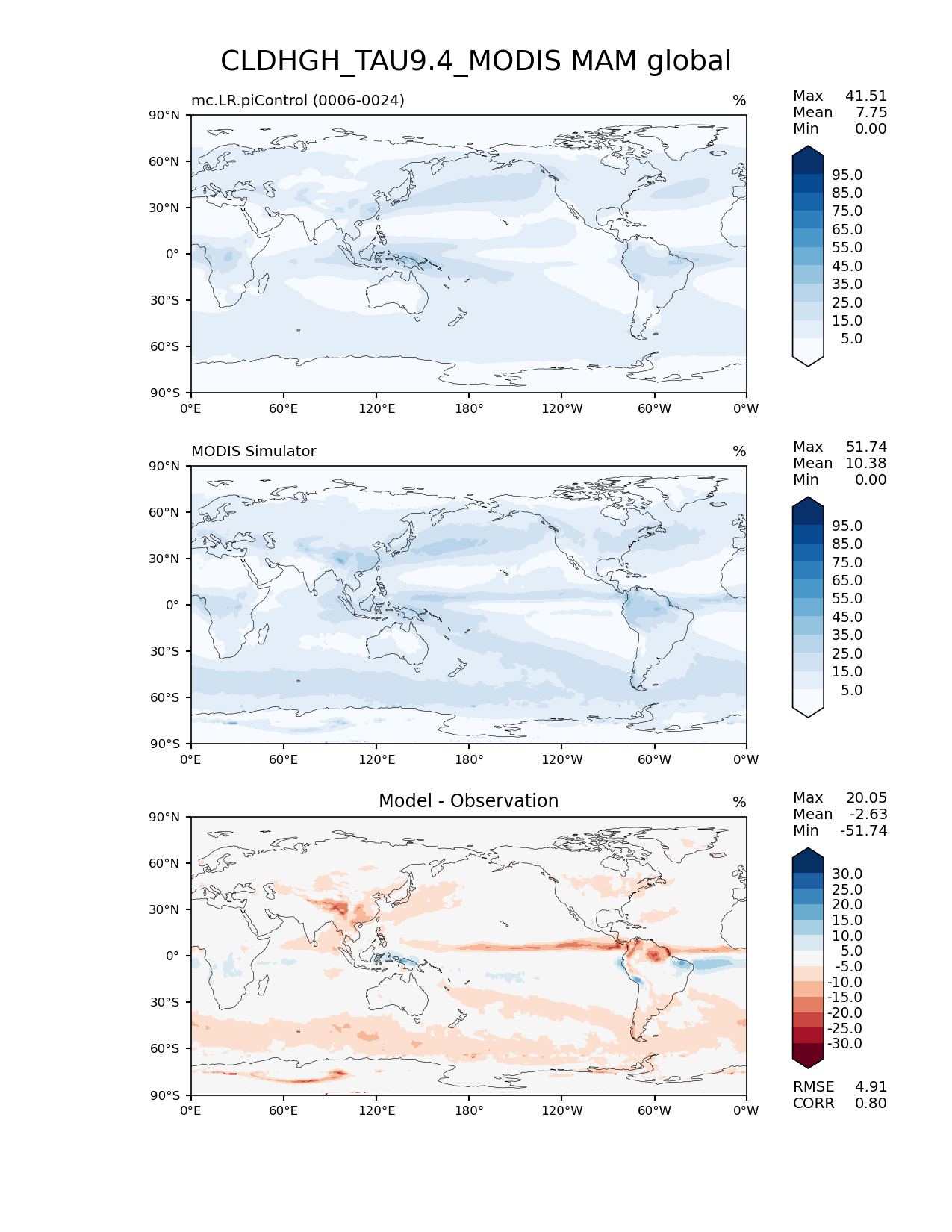 Use this command to recreate this image: | e3sm_diags lat_lon --no_viewer --case_id 'Cloud MODIS' --sets 'lat_lon' --run_type 'model_vs_obs' --variables 'CLDHGH_TAU9.4_MODIS' --seasons 'MAM' --regions 'global' --regrid_tool 'esmf' --regrid_method 'conservative' --main_title 'CLDHGH_TAU9.4_MODIS MAM global' --backend 'mpl' --output_format 'png' --canvas_size_w '1212' --canvas_size_h '1628' --figsize '8.5' '11.0' --dpi '150' --arrows --contour_levels '5' '15' '25' '35' '45' '55' '65' '75' '85' '95' --test_name 'mc.LR.piControl' --test_title ' ' --test_colormap 'Blues' --ref_name 'MODISCOSP' --reference_name 'MODIS Simulator' --reference_colormap 'Blues' --diff_title 'Model - Observation' --diff_colormap 'RdBu' --diff_levels '-30' '-25' '-20' '-15' '-10' '-5' '5' '10' '15' '20' '25' '30' --num_workers '4' --granulate 'variables' 'seasons' 'plevs' 'regions' --selectors 'sets' 'seasons' --reference_data_path '/global/cfs/cdirs/e3sm/acme_diags/obs_for_e3sm_diags/climatology/' --test_data_path '/global/cscratch1/sd/xsongsio/E3SM_simulations/mc.LR.piControl/diag/clim_rgr/19yr/' --results_dir '/global/cfs/cdirs/e3sm/www/xsongsio/mc.LR.piControl/19yr' |