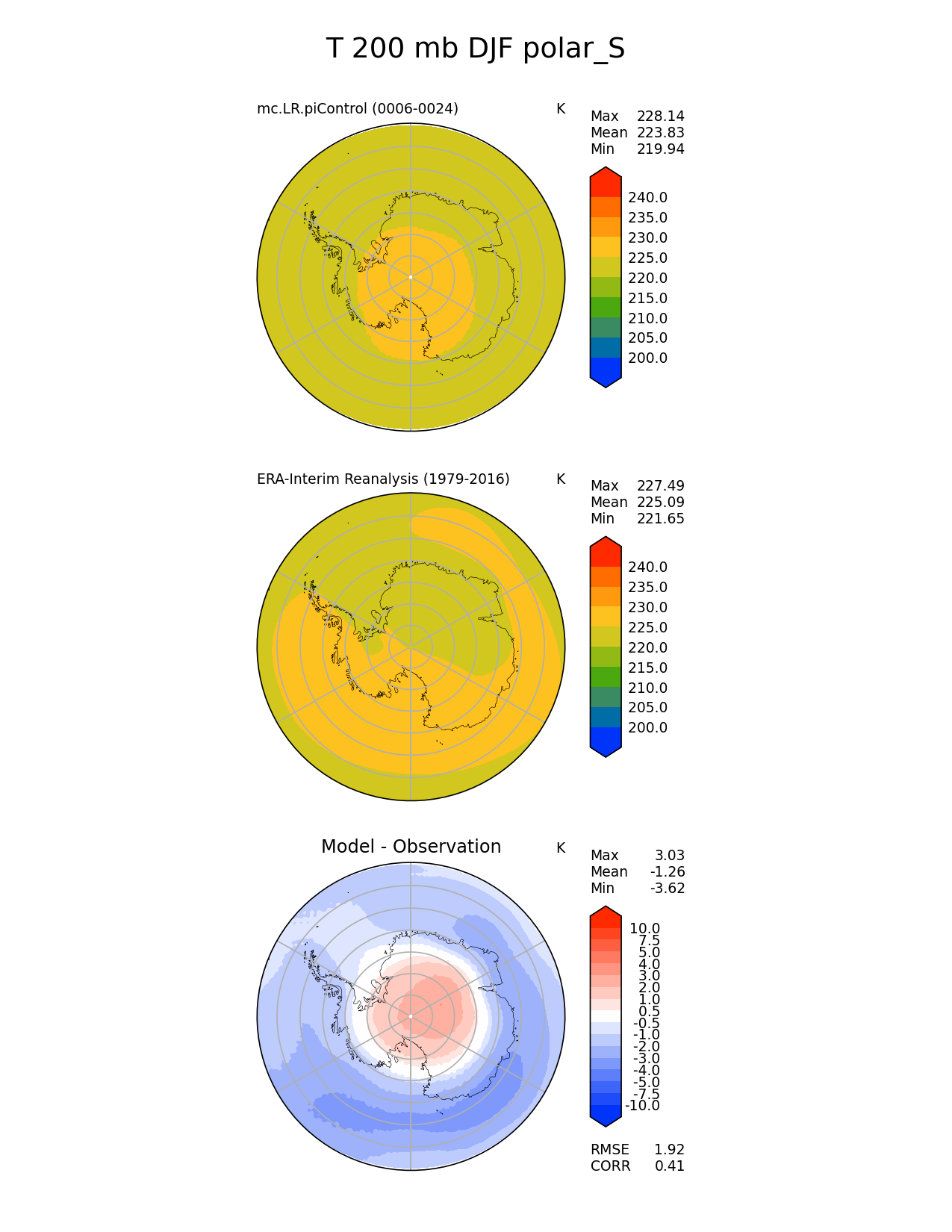 Use this command to recreate this image: | e3sm_diags polar --no_viewer --case_id 'ERA-Interim' --sets 'polar' --run_type 'model_vs_obs' --variables 'T' --seasons 'DJF' --regions 'polar_S' --regrid_tool 'esmf' --regrid_method 'conservative' --plevs '200.0' --main_title 'T 200 mb DJF polar_S' --backend 'mpl' --output_format 'png' --canvas_size_w '1212' --canvas_size_h '1628' --figsize '8.5' '11.0' --dpi '150' --arrows --contour_levels '200' '205' '210' '215' '220' '225' '230' '235' '240' --test_name 'mc.LR.piControl' --test_title ' ' --test_colormap 'cet_rainbow.rgb' --ref_name 'ERA-Interim' --reference_name 'ERA-Interim Reanalysis' --reference_colormap 'cet_rainbow.rgb' --diff_title 'Model - Observation' --diff_colormap 'diverging_bwr.rgb' --diff_levels '-10' '-7.5' '-5' '-4' '-3' '-2' '-1' '-0.5' '0.5' '1' '2' '3' '4' '5' '7.5' '10' --num_workers '4' --granulate 'variables' 'seasons' 'plevs' 'regions' --selectors 'sets' 'seasons' --reference_data_path '/global/cfs/cdirs/e3sm/acme_diags/obs_for_e3sm_diags/climatology/' --test_data_path '/global/cscratch1/sd/xsongsio/E3SM_simulations/mc.LR.piControl/diag/clim_rgr/19yr/' --results_dir '/global/cfs/cdirs/e3sm/www/xsongsio/mc.LR.piControl/19yr' |