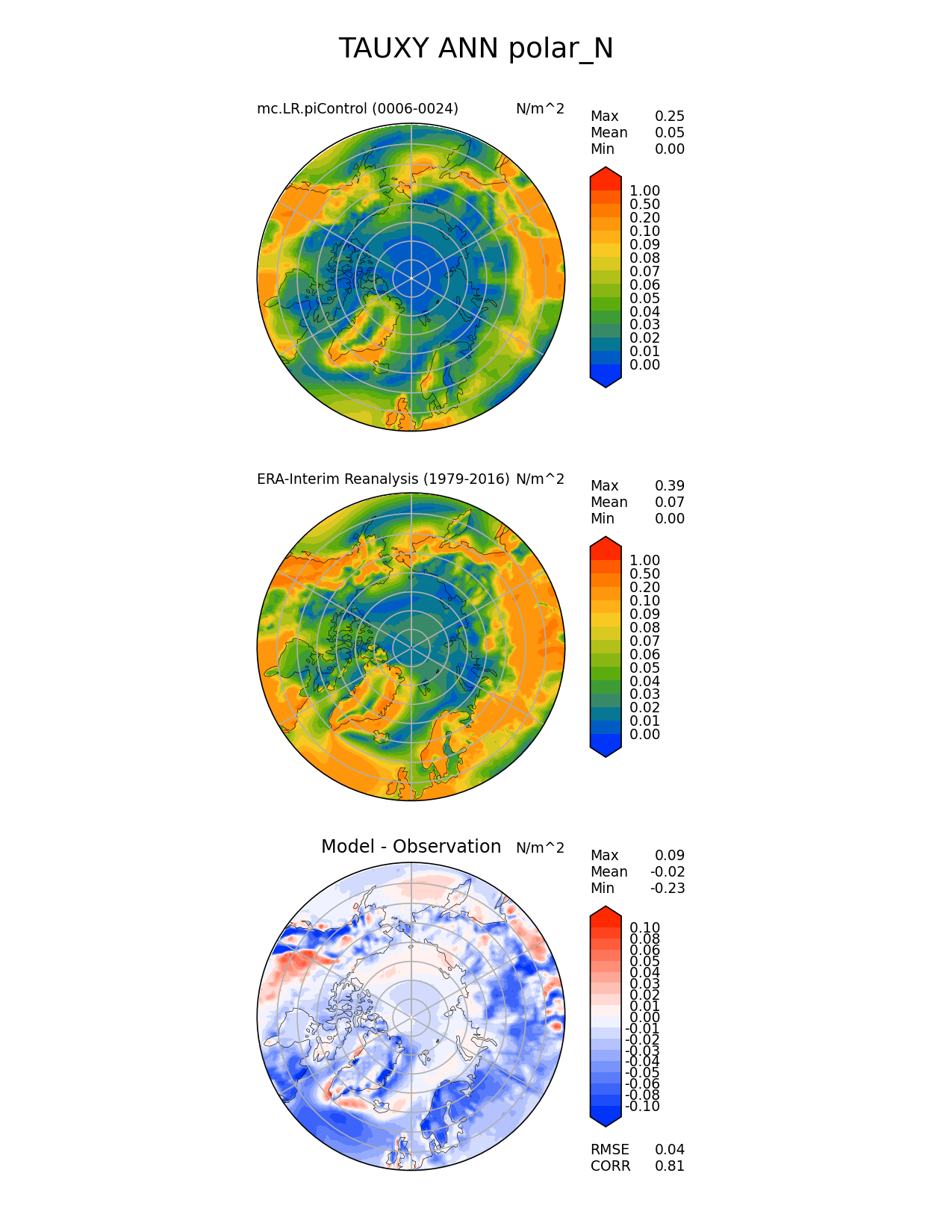 Use this command to recreate this image: | e3sm_diags polar --no_viewer --case_id 'ERA-Interim' --sets 'polar' --run_type 'model_vs_obs' --variables 'TAUXY' --seasons 'ANN' --regions 'polar_N' --regrid_tool 'esmf' --regrid_method 'conservative' --main_title 'TAUXY ANN polar_N' --backend 'mpl' --output_format 'png' --canvas_size_w '1212' --canvas_size_h '1628' --figsize '8.5' '11.0' --dpi '150' --arrows --contour_levels '0.0' '0.01' '0.02' '0.03' '0.04' '0.05' '0.06' '0.07' '0.08' '0.09' '0.1' '0.2' '0.5' '1.0' --test_name 'mc.LR.piControl' --test_title ' ' --test_colormap 'cet_rainbow.rgb' --ref_name 'ERA-Interim' --reference_name 'ERA-Interim Reanalysis' --reference_colormap 'cet_rainbow.rgb' --diff_title 'Model - Observation' --diff_colormap 'diverging_bwr.rgb' --diff_levels '-0.1' '-0.08' '-0.06' '-0.05' '-0.04' '-0.03' '-0.02' '-0.01' '0' '0.01' '0.02' '0.03' '0.04' '0.05' '0.06' '0.08' '0.1' --num_workers '4' --granulate 'variables' 'seasons' 'plevs' 'regions' --selectors 'sets' 'seasons' --reference_data_path '/global/cfs/cdirs/e3sm/acme_diags/obs_for_e3sm_diags/climatology/' --test_data_path '/global/cscratch1/sd/xsongsio/E3SM_simulations/mc.LR.piControl/diag/clim_rgr/19yr/' --results_dir '/global/cfs/cdirs/e3sm/www/xsongsio/mc.LR.piControl/19yr' |
