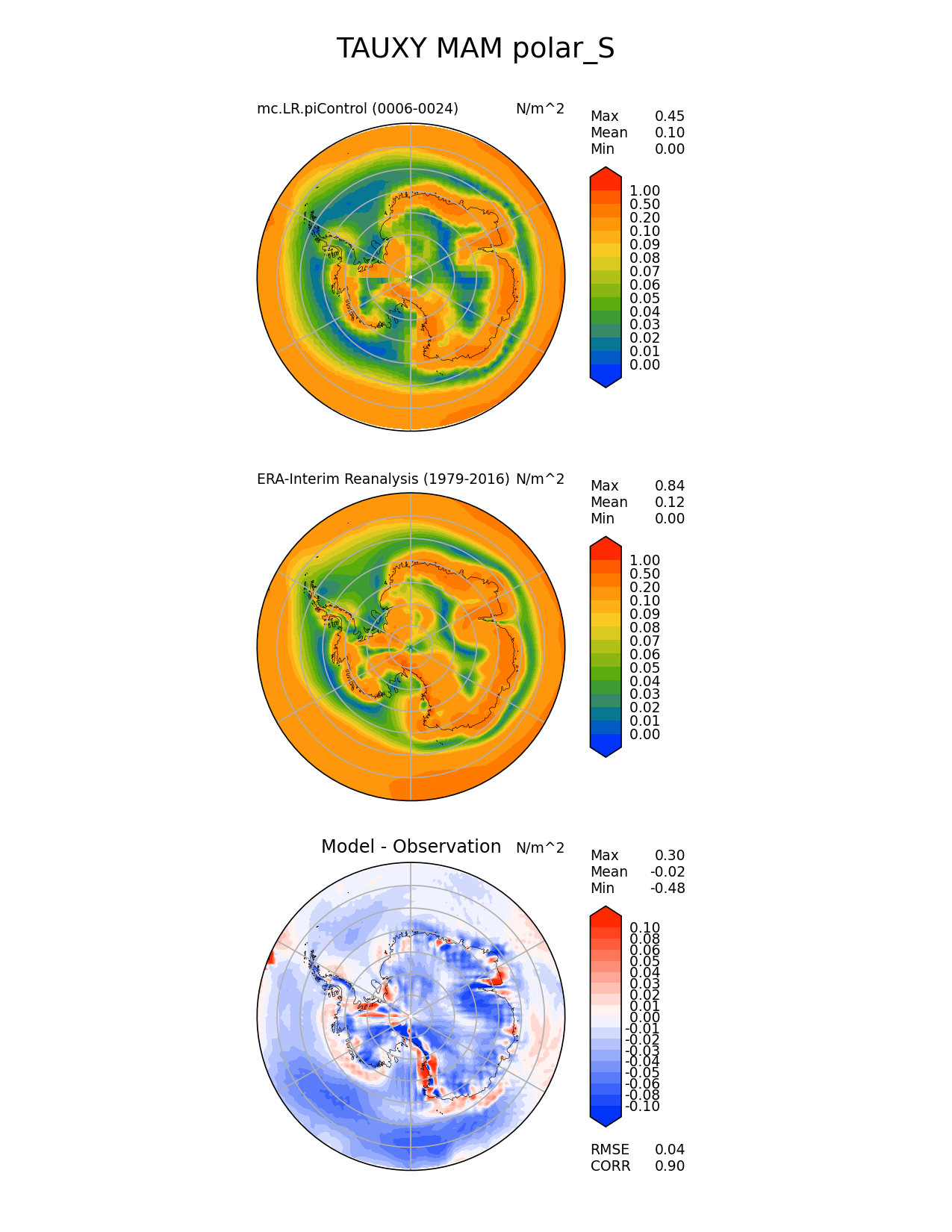 Use this command to recreate this image: | e3sm_diags polar --no_viewer --case_id 'ERA-Interim' --sets 'polar' --run_type 'model_vs_obs' --variables 'TAUXY' --seasons 'MAM' --regions 'polar_S' --regrid_tool 'esmf' --regrid_method 'conservative' --main_title 'TAUXY MAM polar_S' --backend 'mpl' --output_format 'png' --canvas_size_w '1212' --canvas_size_h '1628' --figsize '8.5' '11.0' --dpi '150' --arrows --contour_levels '0.0' '0.01' '0.02' '0.03' '0.04' '0.05' '0.06' '0.07' '0.08' '0.09' '0.1' '0.2' '0.5' '1.0' --test_name 'mc.LR.piControl' --test_title ' ' --test_colormap 'cet_rainbow.rgb' --ref_name 'ERA-Interim' --reference_name 'ERA-Interim Reanalysis' --reference_colormap 'cet_rainbow.rgb' --diff_title 'Model - Observation' --diff_colormap 'diverging_bwr.rgb' --diff_levels '-0.1' '-0.08' '-0.06' '-0.05' '-0.04' '-0.03' '-0.02' '-0.01' '0' '0.01' '0.02' '0.03' '0.04' '0.05' '0.06' '0.08' '0.1' --num_workers '4' --granulate 'variables' 'seasons' 'plevs' 'regions' --selectors 'sets' 'seasons' --reference_data_path '/global/cfs/cdirs/e3sm/acme_diags/obs_for_e3sm_diags/climatology/' --test_data_path '/global/cscratch1/sd/xsongsio/E3SM_simulations/mc.LR.piControl/diag/clim_rgr/19yr/' --results_dir '/global/cfs/cdirs/e3sm/www/xsongsio/mc.LR.piControl/19yr' |