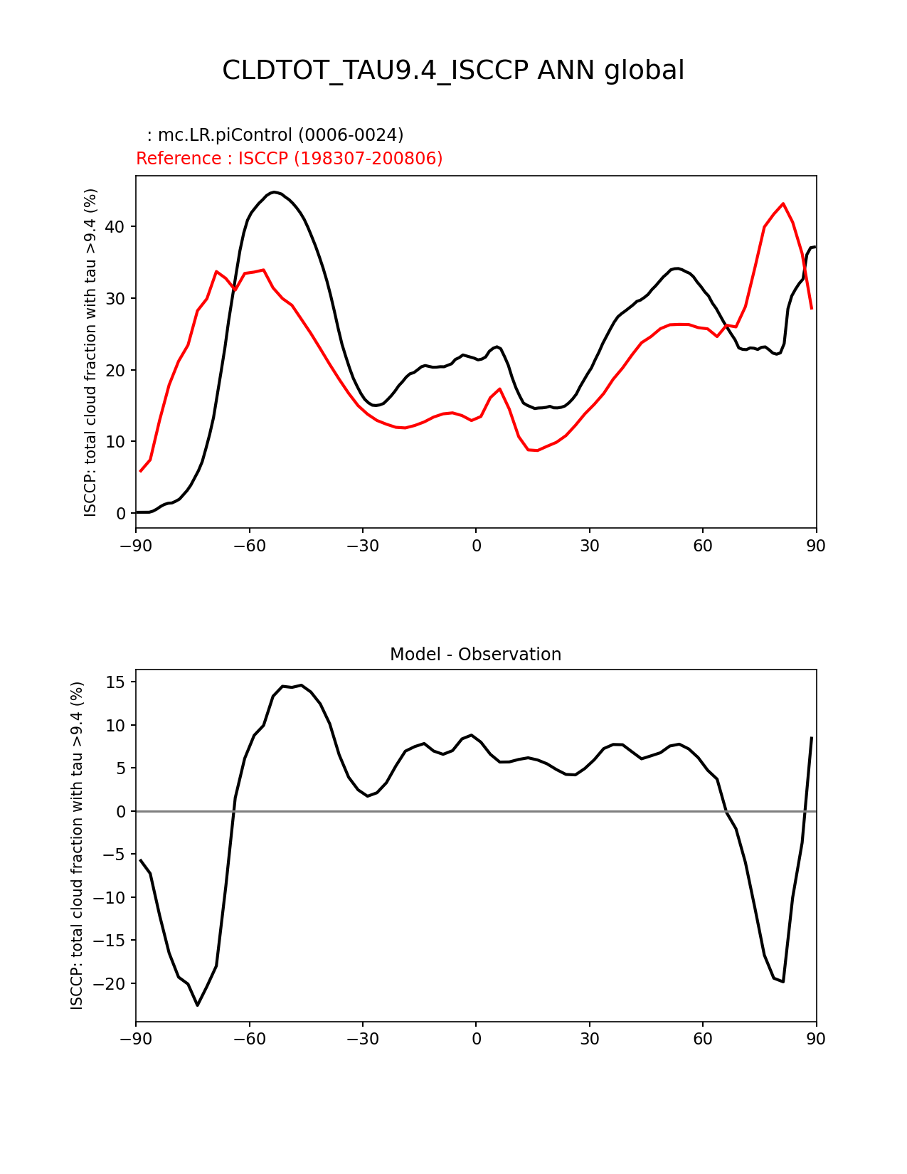 Use this command to recreate this image: | e3sm_diags zonal_mean_xy --no_viewer --case_id 'Cloud ISCCP' --sets 'zonal_mean_xy' --run_type 'model_vs_obs' --variables 'CLDTOT_TAU9.4_ISCCP' --seasons 'ANN' --regions 'global' --regrid_tool 'esmf' --regrid_method 'conservative' --main_title 'CLDTOT_TAU9.4_ISCCP ANN global' --backend 'mpl' --output_format 'png' --canvas_size_w '1212' --canvas_size_h '1628' --figsize '8.5' '11.0' --dpi '150' --arrows --test_name 'mc.LR.piControl' --test_title ' ' --test_colormap 'cet_rainbow.rgb' --ref_name 'ISCCPCOSP' --reference_name 'ISCCP' --reference_colormap 'cet_rainbow.rgb' --diff_title 'Model - Observation' --diff_colormap 'diverging_bwr.rgb' --num_workers '4' --granulate 'variables' 'seasons' 'plevs' 'regions' --selectors 'sets' 'seasons' --reference_data_path '/global/cfs/cdirs/e3sm/acme_diags/obs_for_e3sm_diags/climatology/' --test_data_path '/global/cscratch1/sd/xsongsio/E3SM_simulations/mc.LR.piControl/diag/clim_rgr/19yr/' --results_dir '/global/cfs/cdirs/e3sm/www/xsongsio/mc.LR.piControl/19yr' |