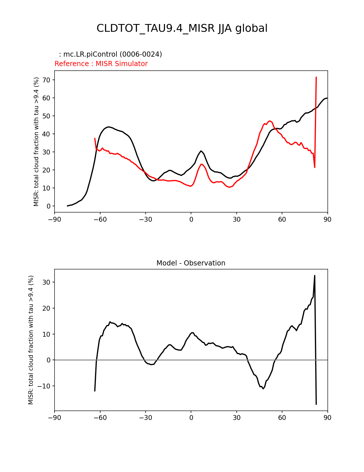 Use this command to recreate this image: | e3sm_diags zonal_mean_xy --no_viewer --case_id 'Cloud MISR' --sets 'zonal_mean_xy' --run_type 'model_vs_obs' --variables 'CLDTOT_TAU9.4_MISR' --seasons 'JJA' --regions 'global' --regrid_tool 'esmf' --regrid_method 'conservative' --main_title 'CLDTOT_TAU9.4_MISR JJA global' --backend 'mpl' --output_format 'png' --canvas_size_w '1212' --canvas_size_h '1628' --figsize '8.5' '11.0' --dpi '150' --arrows --test_name 'mc.LR.piControl' --test_title ' ' --test_colormap 'cet_rainbow.rgb' --ref_name 'MISRCOSP' --reference_name 'MISR Simulator' --reference_colormap 'cet_rainbow.rgb' --diff_title 'Model - Observation' --diff_colormap 'diverging_bwr.rgb' --num_workers '4' --granulate 'variables' 'seasons' 'plevs' 'regions' --selectors 'sets' 'seasons' --reference_data_path '/global/cfs/cdirs/e3sm/acme_diags/obs_for_e3sm_diags/climatology/' --test_data_path '/global/cscratch1/sd/xsongsio/E3SM_simulations/mc.LR.piControl/diag/clim_rgr/19yr/' --results_dir '/global/cfs/cdirs/e3sm/www/xsongsio/mc.LR.piControl/19yr' |