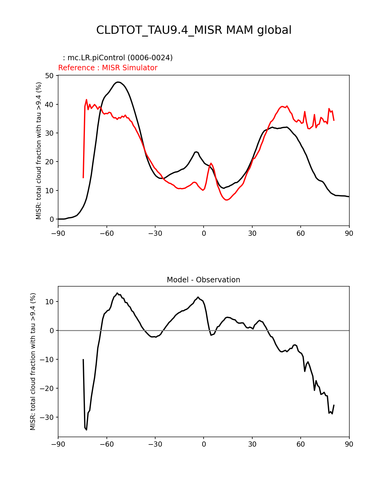 Use this command to recreate this image: | e3sm_diags zonal_mean_xy --no_viewer --case_id 'Cloud MISR' --sets 'zonal_mean_xy' --run_type 'model_vs_obs' --variables 'CLDTOT_TAU9.4_MISR' --seasons 'MAM' --regions 'global' --regrid_tool 'esmf' --regrid_method 'conservative' --main_title 'CLDTOT_TAU9.4_MISR MAM global' --backend 'mpl' --output_format 'png' --canvas_size_w '1212' --canvas_size_h '1628' --figsize '8.5' '11.0' --dpi '150' --arrows --test_name 'mc.LR.piControl' --test_title ' ' --test_colormap 'cet_rainbow.rgb' --ref_name 'MISRCOSP' --reference_name 'MISR Simulator' --reference_colormap 'cet_rainbow.rgb' --diff_title 'Model - Observation' --diff_colormap 'diverging_bwr.rgb' --num_workers '4' --granulate 'variables' 'seasons' 'plevs' 'regions' --selectors 'sets' 'seasons' --reference_data_path '/global/cfs/cdirs/e3sm/acme_diags/obs_for_e3sm_diags/climatology/' --test_data_path '/global/cscratch1/sd/xsongsio/E3SM_simulations/mc.LR.piControl/diag/clim_rgr/19yr/' --results_dir '/global/cfs/cdirs/e3sm/www/xsongsio/mc.LR.piControl/19yr' |