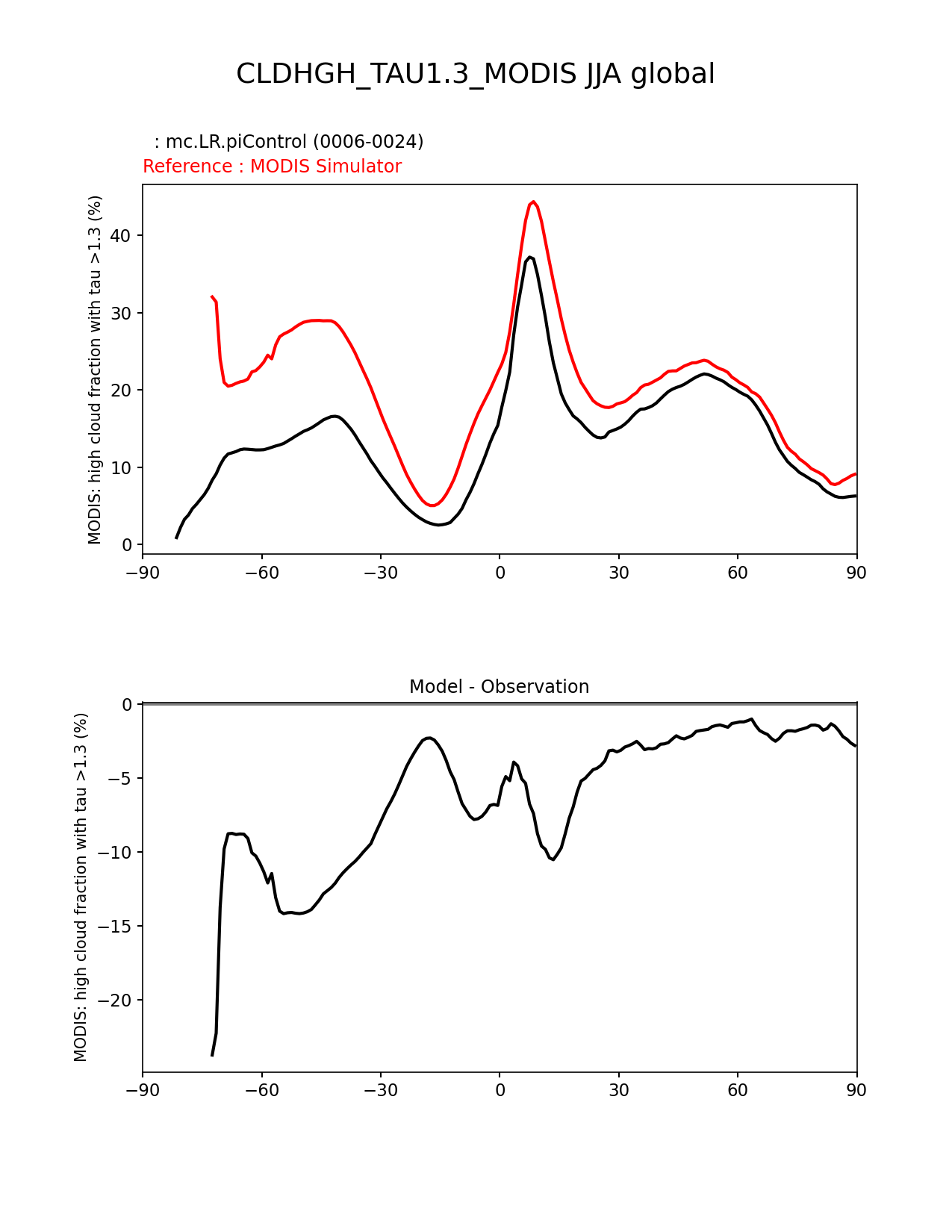 Use this command to recreate this image: | e3sm_diags zonal_mean_xy --no_viewer --case_id 'Cloud MODIS' --sets 'zonal_mean_xy' --run_type 'model_vs_obs' --variables 'CLDHGH_TAU1.3_MODIS' --seasons 'JJA' --regions 'global' --regrid_tool 'esmf' --regrid_method 'conservative' --main_title 'CLDHGH_TAU1.3_MODIS JJA global' --backend 'mpl' --output_format 'png' --canvas_size_w '1212' --canvas_size_h '1628' --figsize '8.5' '11.0' --dpi '150' --arrows --test_name 'mc.LR.piControl' --test_title ' ' --test_colormap 'cet_rainbow.rgb' --ref_name 'MODISCOSP' --reference_name 'MODIS Simulator' --reference_colormap 'cet_rainbow.rgb' --diff_title 'Model - Observation' --diff_colormap 'diverging_bwr.rgb' --num_workers '4' --granulate 'variables' 'seasons' 'plevs' 'regions' --selectors 'sets' 'seasons' --reference_data_path '/global/cfs/cdirs/e3sm/acme_diags/obs_for_e3sm_diags/climatology/' --test_data_path '/global/cscratch1/sd/xsongsio/E3SM_simulations/mc.LR.piControl/diag/clim_rgr/19yr/' --results_dir '/global/cfs/cdirs/e3sm/www/xsongsio/mc.LR.piControl/19yr' |