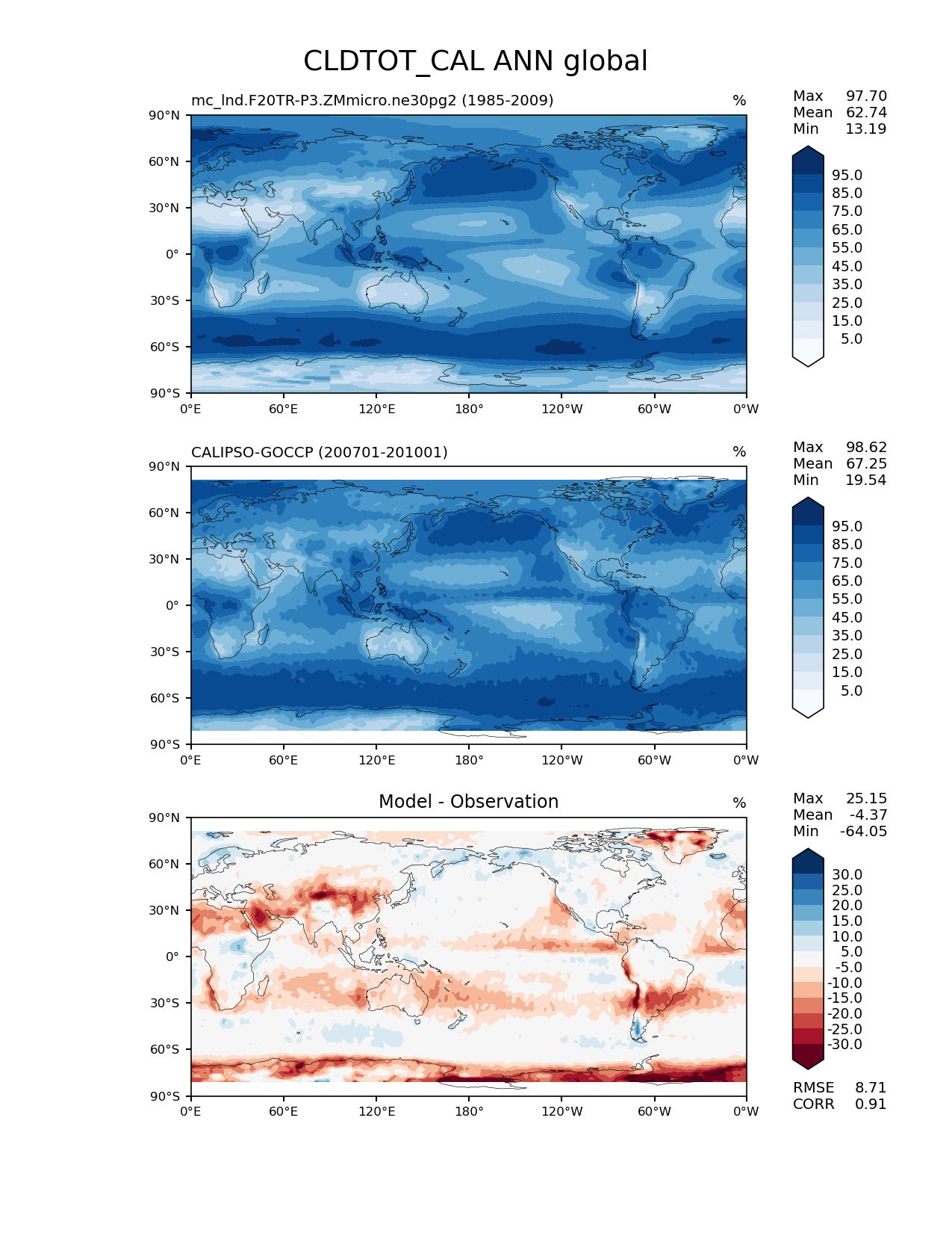 Use this command to recreate this image: | e3sm_diags lat_lon --no_viewer --case_id 'Cloud Calipso' --sets 'lat_lon' --run_type 'model_vs_obs' --variables 'CLDTOT_CAL' --seasons 'ANN' --regions 'global' --regrid_tool 'esmf' --regrid_method 'conservative' --main_title 'CLDTOT_CAL ANN global' --backend 'mpl' --output_format 'png' --canvas_size_w '1212' --canvas_size_h '1628' --figsize '8.5' '11.0' --dpi '150' --arrows --contour_levels '5' '15' '25' '35' '45' '55' '65' '75' '85' '95' --test_name 'mc_lnd.F20TR-P3.ZMmicro.ne30pg2' --test_title ' ' --test_colormap 'Blues' --ref_name 'CALIPSOCOSP' --reference_name 'CALIPSO-GOCCP' --reference_colormap 'Blues' --diff_title 'Model - Observation' --diff_colormap 'RdBu' --diff_levels '-30' '-25' '-20' '-15' '-10' '-5' '5' '10' '15' '20' '25' '30' --num_workers '4' --granulate 'variables' 'seasons' 'plevs' 'regions' --selectors 'sets' 'seasons' --reference_data_path '/global/cfs/cdirs/e3sm/acme_diags/obs_for_e3sm_diags/climatology/' --test_data_path '/global/cscratch1/sd/xsongsio/E3SM_simulations/mc_lnd.F20TR-P3.ZMmicro.ne30pg2/diag/clim_rgr/25yr/' --results_dir '/global/cfs/cdirs/e3sm/www/xsongsio/mc_lnd.F20TR-P3.ZMmicro.ne30pg2/25yr' |