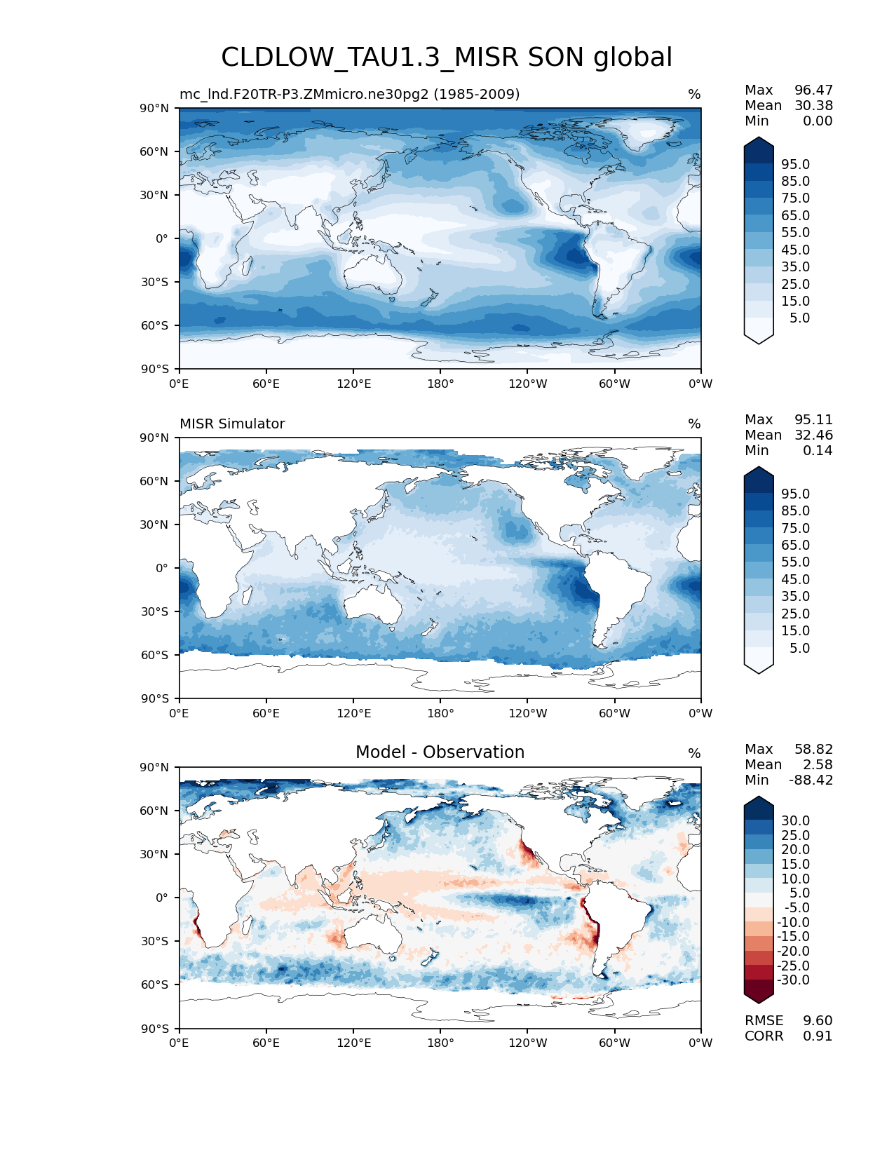 Use this command to recreate this image: | e3sm_diags lat_lon --no_viewer --case_id 'Cloud MISR' --sets 'lat_lon' --run_type 'model_vs_obs' --variables 'CLDLOW_TAU1.3_MISR' --seasons 'SON' --regions 'global' --regrid_tool 'esmf' --regrid_method 'conservative' --main_title 'CLDLOW_TAU1.3_MISR SON global' --backend 'mpl' --output_format 'png' --canvas_size_w '1212' --canvas_size_h '1628' --figsize '8.5' '11.0' --dpi '150' --arrows --contour_levels '5' '15' '25' '35' '45' '55' '65' '75' '85' '95' --test_name 'mc_lnd.F20TR-P3.ZMmicro.ne30pg2' --test_title ' ' --test_colormap 'Blues' --ref_name 'MISRCOSP' --reference_name 'MISR Simulator' --reference_colormap 'Blues' --diff_title 'Model - Observation' --diff_colormap 'RdBu' --diff_levels '-30' '-25' '-20' '-15' '-10' '-5' '5' '10' '15' '20' '25' '30' --num_workers '4' --granulate 'variables' 'seasons' 'plevs' 'regions' --selectors 'sets' 'seasons' --reference_data_path '/global/cfs/cdirs/e3sm/acme_diags/obs_for_e3sm_diags/climatology/' --test_data_path '/global/cscratch1/sd/xsongsio/E3SM_simulations/mc_lnd.F20TR-P3.ZMmicro.ne30pg2/diag/clim_rgr/25yr/' --results_dir '/global/cfs/cdirs/e3sm/www/xsongsio/mc_lnd.F20TR-P3.ZMmicro.ne30pg2/25yr' |