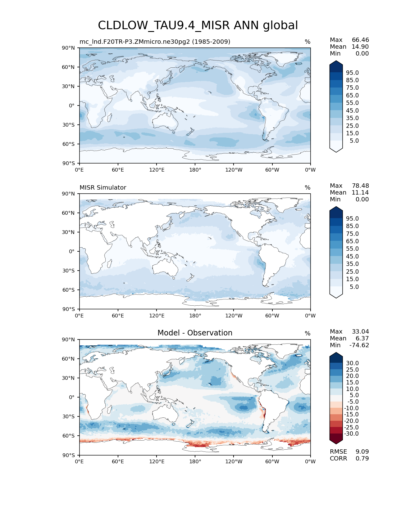 Use this command to recreate this image: | e3sm_diags lat_lon --no_viewer --case_id 'Cloud MISR' --sets 'lat_lon' --run_type 'model_vs_obs' --variables 'CLDLOW_TAU9.4_MISR' --seasons 'ANN' --regions 'global' --regrid_tool 'esmf' --regrid_method 'conservative' --main_title 'CLDLOW_TAU9.4_MISR ANN global' --backend 'mpl' --output_format 'png' --canvas_size_w '1212' --canvas_size_h '1628' --figsize '8.5' '11.0' --dpi '150' --arrows --contour_levels '5' '15' '25' '35' '45' '55' '65' '75' '85' '95' --test_name 'mc_lnd.F20TR-P3.ZMmicro.ne30pg2' --test_title ' ' --test_colormap 'Blues' --ref_name 'MISRCOSP' --reference_name 'MISR Simulator' --reference_colormap 'Blues' --diff_title 'Model - Observation' --diff_colormap 'RdBu' --diff_levels '-30' '-25' '-20' '-15' '-10' '-5' '5' '10' '15' '20' '25' '30' --num_workers '4' --granulate 'variables' 'seasons' 'plevs' 'regions' --selectors 'sets' 'seasons' --reference_data_path '/global/cfs/cdirs/e3sm/acme_diags/obs_for_e3sm_diags/climatology/' --test_data_path '/global/cscratch1/sd/xsongsio/E3SM_simulations/mc_lnd.F20TR-P3.ZMmicro.ne30pg2/diag/clim_rgr/25yr/' --results_dir '/global/cfs/cdirs/e3sm/www/xsongsio/mc_lnd.F20TR-P3.ZMmicro.ne30pg2/25yr' |