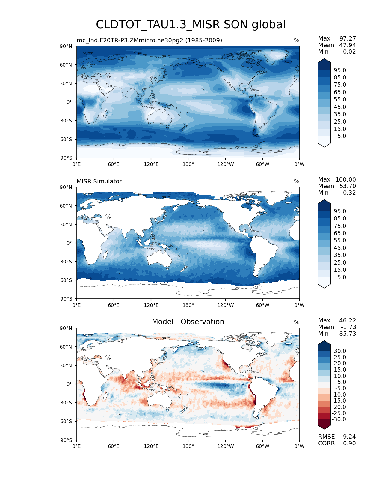Use this command to recreate this image: | e3sm_diags lat_lon --no_viewer --case_id 'Cloud MISR' --sets 'lat_lon' --run_type 'model_vs_obs' --variables 'CLDTOT_TAU1.3_MISR' --seasons 'SON' --regions 'global' --regrid_tool 'esmf' --regrid_method 'conservative' --main_title 'CLDTOT_TAU1.3_MISR SON global' --backend 'mpl' --output_format 'png' --canvas_size_w '1212' --canvas_size_h '1628' --figsize '8.5' '11.0' --dpi '150' --arrows --contour_levels '5' '15' '25' '35' '45' '55' '65' '75' '85' '95' --test_name 'mc_lnd.F20TR-P3.ZMmicro.ne30pg2' --test_title ' ' --test_colormap 'Blues' --ref_name 'MISRCOSP' --reference_name 'MISR Simulator' --reference_colormap 'Blues' --diff_title 'Model - Observation' --diff_colormap 'RdBu' --diff_levels '-30' '-25' '-20' '-15' '-10' '-5' '5' '10' '15' '20' '25' '30' --num_workers '4' --granulate 'variables' 'seasons' 'plevs' 'regions' --selectors 'sets' 'seasons' --reference_data_path '/global/cfs/cdirs/e3sm/acme_diags/obs_for_e3sm_diags/climatology/' --test_data_path '/global/cscratch1/sd/xsongsio/E3SM_simulations/mc_lnd.F20TR-P3.ZMmicro.ne30pg2/diag/clim_rgr/25yr/' --results_dir '/global/cfs/cdirs/e3sm/www/xsongsio/mc_lnd.F20TR-P3.ZMmicro.ne30pg2/25yr' |