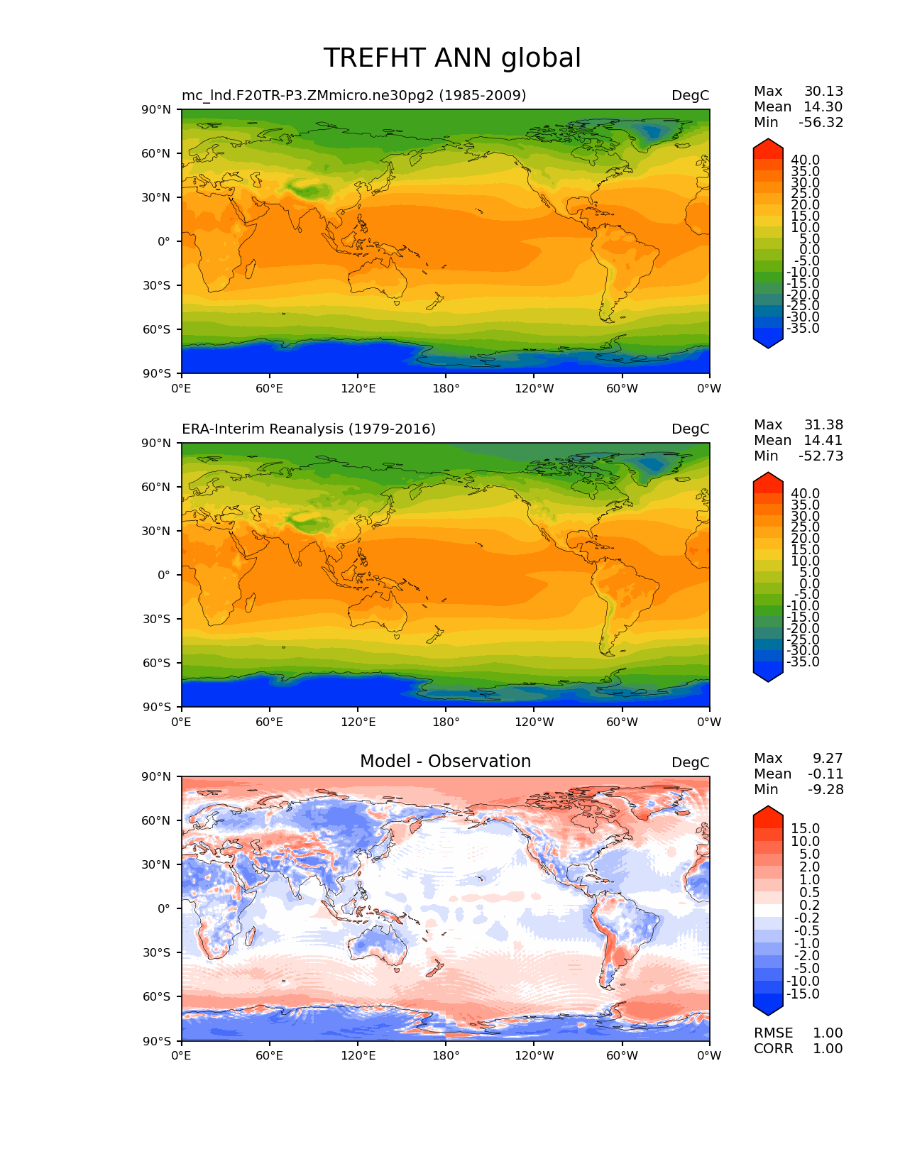 Use this command to recreate this image: | e3sm_diags lat_lon --no_viewer --case_id 'ERA-Interim' --sets 'lat_lon' --run_type 'model_vs_obs' --variables 'TREFHT' --seasons 'ANN' --regions 'global' --regrid_tool 'esmf' --regrid_method 'conservative' --main_title 'TREFHT ANN global' --backend 'mpl' --output_format 'png' --canvas_size_w '1212' --canvas_size_h '1628' --figsize '8.5' '11.0' --dpi '150' --arrows --contour_levels '-35' '-30' '-25' '-20' '-15' '-10' '-5' '0' '5' '10' '15' '20' '25' '30' '35' '40' --test_name 'mc_lnd.F20TR-P3.ZMmicro.ne30pg2' --test_title ' ' --test_colormap 'cet_rainbow.rgb' --ref_name 'ERA-Interim' --reference_name 'ERA-Interim Reanalysis' --reference_colormap 'cet_rainbow.rgb' --diff_title 'Model - Observation' --diff_colormap 'diverging_bwr.rgb' --diff_levels '-15' '-10' '-5' '-2' '-1' '-0.5' '-0.2' '0.2' '0.5' '1' '2' '5' '10' '15' --num_workers '4' --granulate 'variables' 'seasons' 'plevs' 'regions' --selectors 'sets' 'seasons' --reference_data_path '/global/cfs/cdirs/e3sm/acme_diags/obs_for_e3sm_diags/climatology/' --test_data_path '/global/cscratch1/sd/xsongsio/E3SM_simulations/mc_lnd.F20TR-P3.ZMmicro.ne30pg2/diag/clim_rgr/25yr/' --results_dir '/global/cfs/cdirs/e3sm/www/xsongsio/mc_lnd.F20TR-P3.ZMmicro.ne30pg2/25yr' |