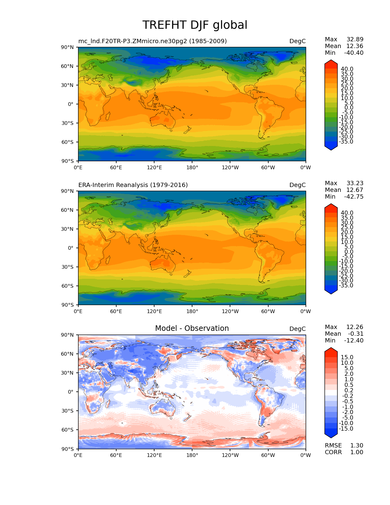 Use this command to recreate this image: | e3sm_diags lat_lon --no_viewer --case_id 'ERA-Interim' --sets 'lat_lon' --run_type 'model_vs_obs' --variables 'TREFHT' --seasons 'DJF' --regions 'global' --regrid_tool 'esmf' --regrid_method 'conservative' --main_title 'TREFHT DJF global' --backend 'mpl' --output_format 'png' --canvas_size_w '1212' --canvas_size_h '1628' --figsize '8.5' '11.0' --dpi '150' --arrows --contour_levels '-35' '-30' '-25' '-20' '-15' '-10' '-5' '0' '5' '10' '15' '20' '25' '30' '35' '40' --test_name 'mc_lnd.F20TR-P3.ZMmicro.ne30pg2' --test_title ' ' --test_colormap 'cet_rainbow.rgb' --ref_name 'ERA-Interim' --reference_name 'ERA-Interim Reanalysis' --reference_colormap 'cet_rainbow.rgb' --diff_title 'Model - Observation' --diff_colormap 'diverging_bwr.rgb' --diff_levels '-15' '-10' '-5' '-2' '-1' '-0.5' '-0.2' '0.2' '0.5' '1' '2' '5' '10' '15' --num_workers '4' --granulate 'variables' 'seasons' 'plevs' 'regions' --selectors 'sets' 'seasons' --reference_data_path '/global/cfs/cdirs/e3sm/acme_diags/obs_for_e3sm_diags/climatology/' --test_data_path '/global/cscratch1/sd/xsongsio/E3SM_simulations/mc_lnd.F20TR-P3.ZMmicro.ne30pg2/diag/clim_rgr/25yr/' --results_dir '/global/cfs/cdirs/e3sm/www/xsongsio/mc_lnd.F20TR-P3.ZMmicro.ne30pg2/25yr' |