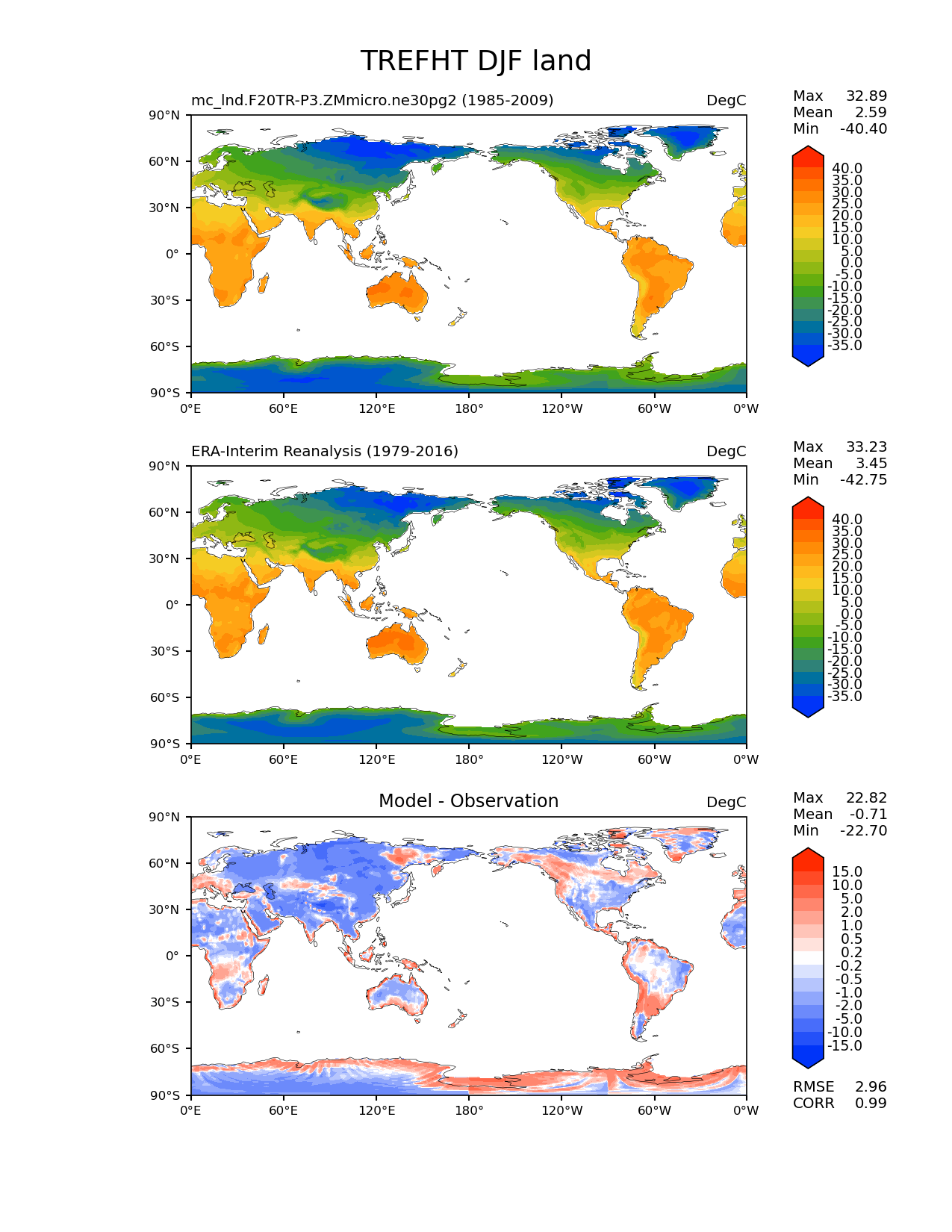 Use this command to recreate this image: | e3sm_diags lat_lon --no_viewer --case_id 'ERA-Interim' --sets 'lat_lon' --run_type 'model_vs_obs' --variables 'TREFHT' --seasons 'DJF' --regions 'land' --regrid_tool 'esmf' --regrid_method 'conservative' --main_title 'TREFHT DJF land' --backend 'mpl' --output_format 'png' --canvas_size_w '1212' --canvas_size_h '1628' --figsize '8.5' '11.0' --dpi '150' --arrows --contour_levels '-35' '-30' '-25' '-20' '-15' '-10' '-5' '0' '5' '10' '15' '20' '25' '30' '35' '40' --test_name 'mc_lnd.F20TR-P3.ZMmicro.ne30pg2' --test_title ' ' --test_colormap 'cet_rainbow.rgb' --ref_name 'ERA-Interim' --reference_name 'ERA-Interim Reanalysis' --reference_colormap 'cet_rainbow.rgb' --diff_title 'Model - Observation' --diff_colormap 'diverging_bwr.rgb' --diff_levels '-15' '-10' '-5' '-2' '-1' '-0.5' '-0.2' '0.2' '0.5' '1' '2' '5' '10' '15' --num_workers '4' --granulate 'variables' 'seasons' 'plevs' 'regions' --selectors 'sets' 'seasons' --reference_data_path '/global/cfs/cdirs/e3sm/acme_diags/obs_for_e3sm_diags/climatology/' --test_data_path '/global/cscratch1/sd/xsongsio/E3SM_simulations/mc_lnd.F20TR-P3.ZMmicro.ne30pg2/diag/clim_rgr/25yr/' --results_dir '/global/cfs/cdirs/e3sm/www/xsongsio/mc_lnd.F20TR-P3.ZMmicro.ne30pg2/25yr' |