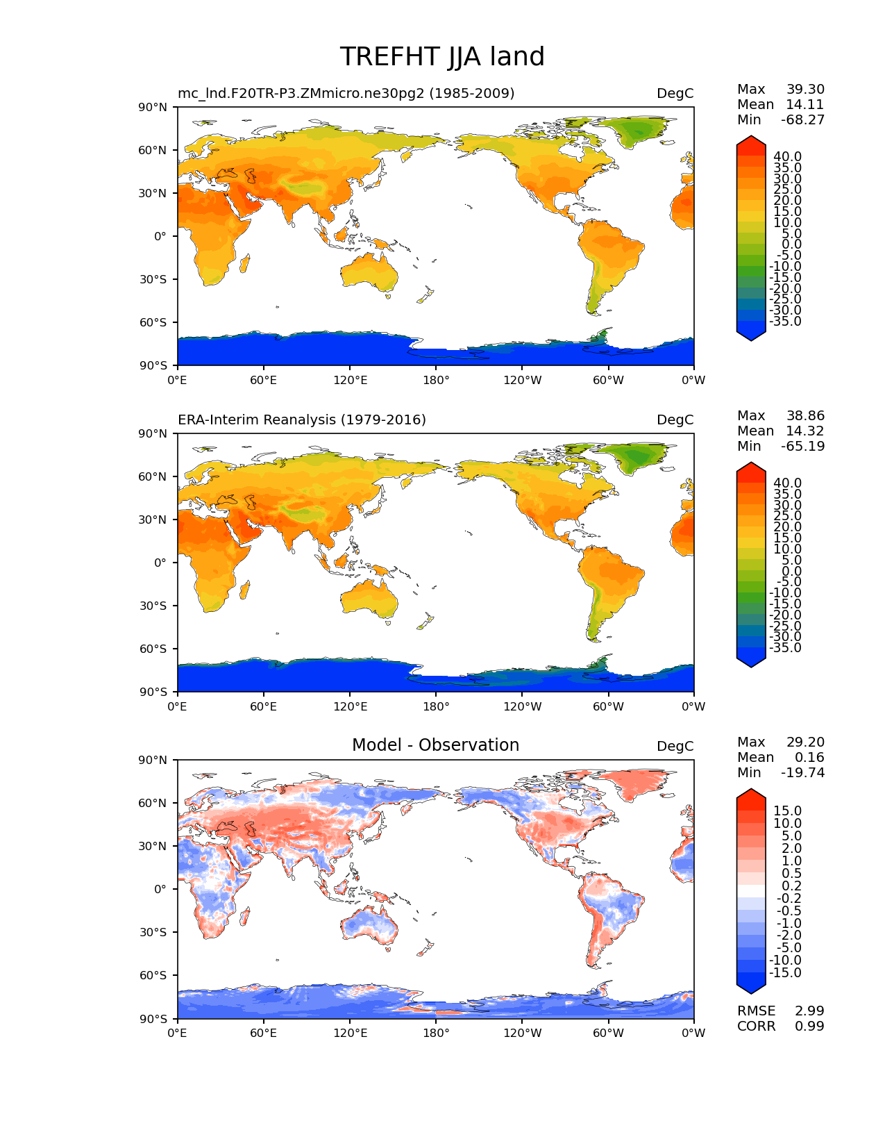 Use this command to recreate this image: | e3sm_diags lat_lon --no_viewer --case_id 'ERA-Interim' --sets 'lat_lon' --run_type 'model_vs_obs' --variables 'TREFHT' --seasons 'JJA' --regions 'land' --regrid_tool 'esmf' --regrid_method 'conservative' --main_title 'TREFHT JJA land' --backend 'mpl' --output_format 'png' --canvas_size_w '1212' --canvas_size_h '1628' --figsize '8.5' '11.0' --dpi '150' --arrows --contour_levels '-35' '-30' '-25' '-20' '-15' '-10' '-5' '0' '5' '10' '15' '20' '25' '30' '35' '40' --test_name 'mc_lnd.F20TR-P3.ZMmicro.ne30pg2' --test_title ' ' --test_colormap 'cet_rainbow.rgb' --ref_name 'ERA-Interim' --reference_name 'ERA-Interim Reanalysis' --reference_colormap 'cet_rainbow.rgb' --diff_title 'Model - Observation' --diff_colormap 'diverging_bwr.rgb' --diff_levels '-15' '-10' '-5' '-2' '-1' '-0.5' '-0.2' '0.2' '0.5' '1' '2' '5' '10' '15' --num_workers '4' --granulate 'variables' 'seasons' 'plevs' 'regions' --selectors 'sets' 'seasons' --reference_data_path '/global/cfs/cdirs/e3sm/acme_diags/obs_for_e3sm_diags/climatology/' --test_data_path '/global/cscratch1/sd/xsongsio/E3SM_simulations/mc_lnd.F20TR-P3.ZMmicro.ne30pg2/diag/clim_rgr/25yr/' --results_dir '/global/cfs/cdirs/e3sm/www/xsongsio/mc_lnd.F20TR-P3.ZMmicro.ne30pg2/25yr' |