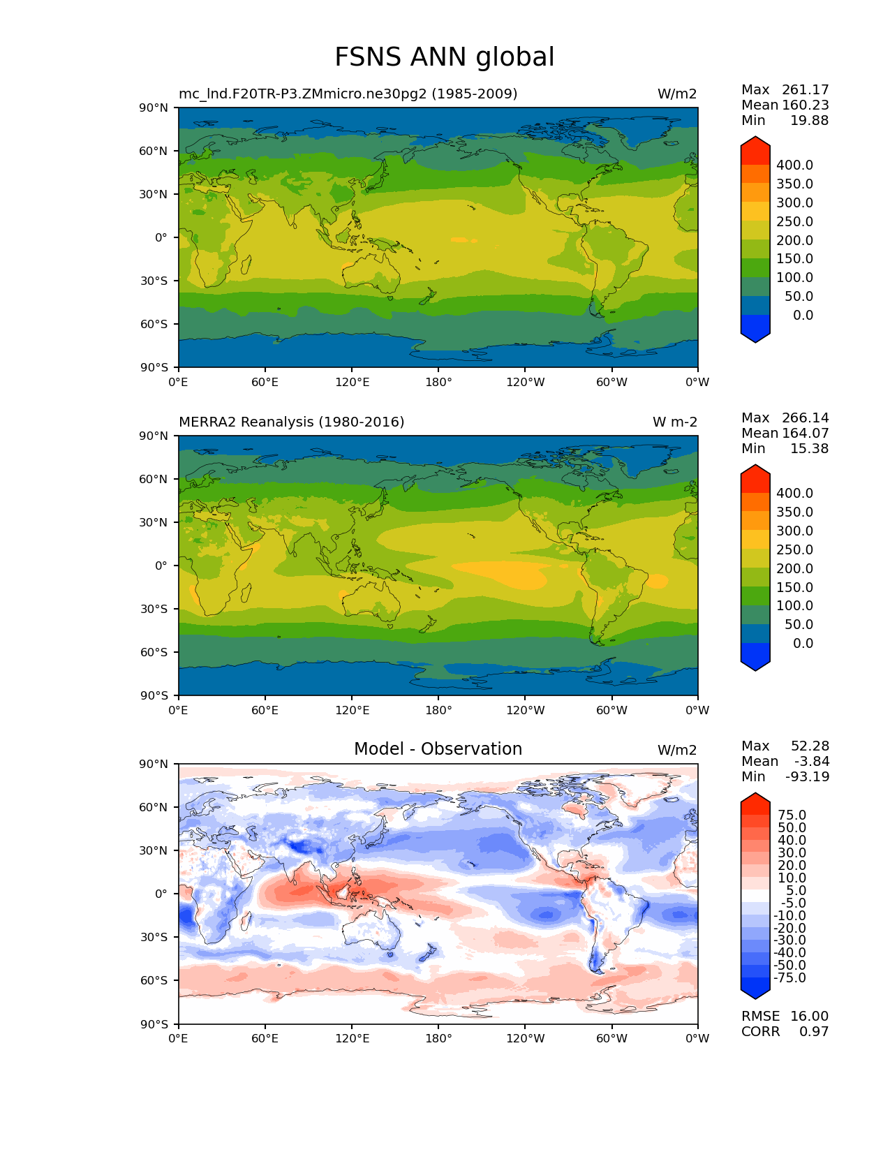Use this command to recreate this image: | e3sm_diags lat_lon --no_viewer --case_id 'MERRA2' --sets 'lat_lon' --run_type 'model_vs_obs' --variables 'FSNS' --seasons 'ANN' --regions 'global' --regrid_tool 'esmf' --regrid_method 'conservative' --main_title 'FSNS ANN global' --backend 'mpl' --output_format 'png' --canvas_size_w '1212' --canvas_size_h '1628' --figsize '8.5' '11.0' --dpi '150' --arrows --contour_levels '0' '50' '100' '150' '200' '250' '300' '350' '400' --test_name 'mc_lnd.F20TR-P3.ZMmicro.ne30pg2' --test_title ' ' --test_colormap 'cet_rainbow.rgb' --ref_name 'MERRA2' --reference_name 'MERRA2 Reanalysis' --reference_colormap 'cet_rainbow.rgb' --diff_title 'Model - Observation' --diff_colormap 'diverging_bwr.rgb' --diff_levels '-75' '-50' '-40' '-30' '-20' '-10' '-5' '5' '10' '20' '30' '40' '50' '75' --num_workers '4' --granulate 'variables' 'seasons' 'plevs' 'regions' --selectors 'sets' 'seasons' --reference_data_path '/global/cfs/cdirs/e3sm/acme_diags/obs_for_e3sm_diags/climatology/' --test_data_path '/global/cscratch1/sd/xsongsio/E3SM_simulations/mc_lnd.F20TR-P3.ZMmicro.ne30pg2/diag/clim_rgr/25yr/' --results_dir '/global/cfs/cdirs/e3sm/www/xsongsio/mc_lnd.F20TR-P3.ZMmicro.ne30pg2/25yr' |