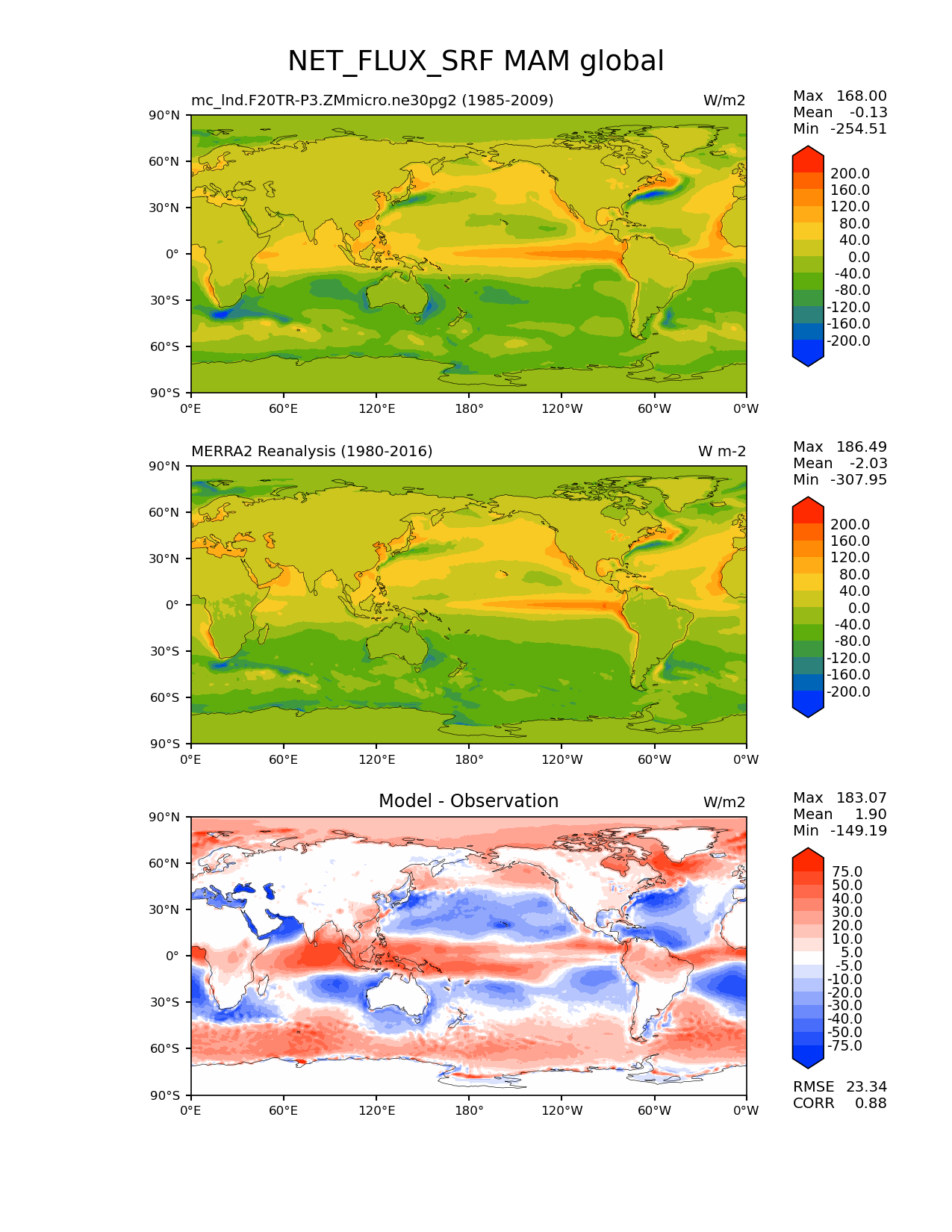 Use this command to recreate this image: | e3sm_diags lat_lon --no_viewer --case_id 'MERRA2' --sets 'lat_lon' --run_type 'model_vs_obs' --variables 'NET_FLUX_SRF' --seasons 'MAM' --regions 'global' --regrid_tool 'esmf' --regrid_method 'conservative' --main_title 'NET_FLUX_SRF MAM global' --backend 'mpl' --output_format 'png' --canvas_size_w '1212' --canvas_size_h '1628' --figsize '8.5' '11.0' --dpi '150' --arrows --contour_levels '-200' '-160' '-120' '-80' '-40' '0' '40' '80' '120' '160' '200' --test_name 'mc_lnd.F20TR-P3.ZMmicro.ne30pg2' --test_title ' ' --test_colormap 'cet_rainbow.rgb' --ref_name 'MERRA2' --reference_name 'MERRA2 Reanalysis' --reference_colormap 'cet_rainbow.rgb' --diff_title 'Model - Observation' --diff_colormap 'diverging_bwr.rgb' --diff_levels '-75' '-50' '-40' '-30' '-20' '-10' '-5' '5' '10' '20' '30' '40' '50' '75' --num_workers '4' --granulate 'variables' 'seasons' 'plevs' 'regions' --selectors 'sets' 'seasons' --reference_data_path '/global/cfs/cdirs/e3sm/acme_diags/obs_for_e3sm_diags/climatology/' --test_data_path '/global/cscratch1/sd/xsongsio/E3SM_simulations/mc_lnd.F20TR-P3.ZMmicro.ne30pg2/diag/clim_rgr/25yr/' --results_dir '/global/cfs/cdirs/e3sm/www/xsongsio/mc_lnd.F20TR-P3.ZMmicro.ne30pg2/25yr' |