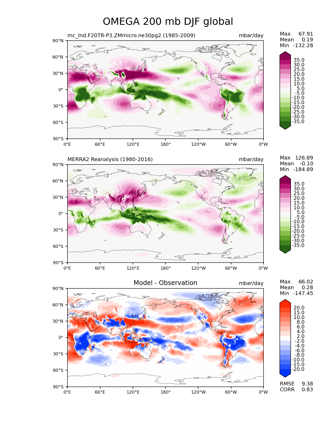 Use this command to recreate this image: | e3sm_diags lat_lon --no_viewer --case_id 'MERRA2' --sets 'lat_lon' --run_type 'model_vs_obs' --variables 'OMEGA' --seasons 'DJF' --regions 'global' --regrid_tool 'esmf' --regrid_method 'conservative' --plevs '200.0' --main_title 'OMEGA 200 mb DJF global' --backend 'mpl' --output_format 'png' --canvas_size_w '1212' --canvas_size_h '1628' --figsize '8.5' '11.0' --dpi '150' --arrows --contour_levels '-35' '-30' '-25' '-20' '-15' '-10' '-5' '5' '10' '15' '20' '25' '30' '35' --test_name 'mc_lnd.F20TR-P3.ZMmicro.ne30pg2' --test_title ' ' --test_colormap 'PiYG_r' --ref_name 'MERRA2' --reference_name 'MERRA2 Reanalysis' --reference_colormap 'PiYG_r' --diff_title 'Model - Observation' --diff_colormap 'diverging_bwr.rgb' --diff_levels '-20' '-15' '-10' '-8' '-6' '-4' '-2' '2' '4' '6' '8' '10' '15' '20' --num_workers '4' --granulate 'variables' 'seasons' 'plevs' 'regions' --selectors 'sets' 'seasons' --reference_data_path '/global/cfs/cdirs/e3sm/acme_diags/obs_for_e3sm_diags/climatology/' --test_data_path '/global/cscratch1/sd/xsongsio/E3SM_simulations/mc_lnd.F20TR-P3.ZMmicro.ne30pg2/diag/clim_rgr/25yr/' --results_dir '/global/cfs/cdirs/e3sm/www/xsongsio/mc_lnd.F20TR-P3.ZMmicro.ne30pg2/25yr' |