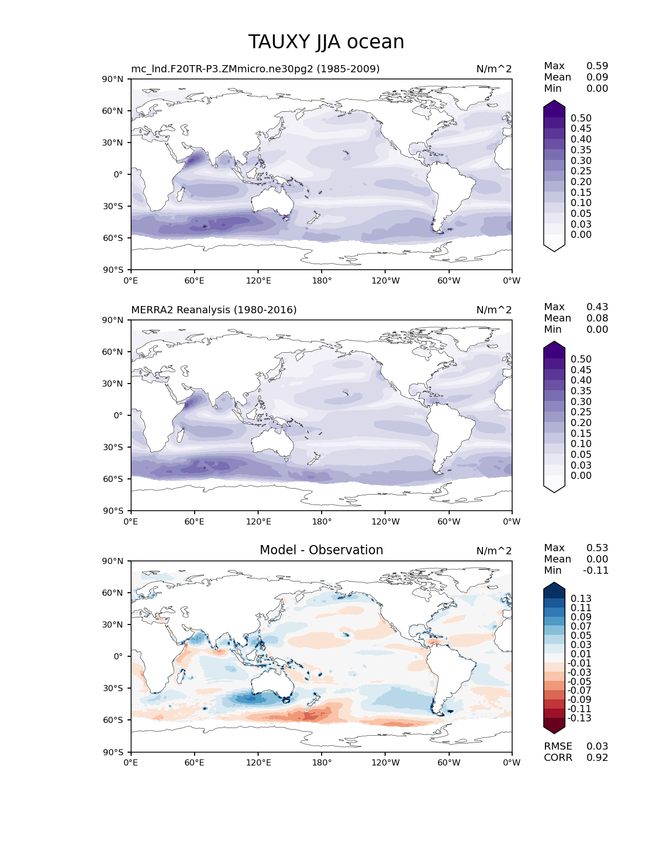 Use this command to recreate this image: | e3sm_diags lat_lon --no_viewer --case_id 'MERRA2' --sets 'lat_lon' --run_type 'model_vs_obs' --variables 'TAUXY' --seasons 'JJA' --regions 'ocean' --regrid_tool 'esmf' --regrid_method 'conservative' --main_title 'TAUXY JJA ocean' --backend 'mpl' --output_format 'png' --canvas_size_w '1212' --canvas_size_h '1628' --figsize '8.5' '11.0' --dpi '150' --arrows --contour_levels '0.0' '0.025' '0.05' '0.1' '0.15' '0.2' '0.25' '0.3' '0.35' '0.4' '0.45' '0.5' --test_name 'mc_lnd.F20TR-P3.ZMmicro.ne30pg2' --test_title ' ' --test_colormap 'Purples' --ref_name 'MERRA2' --reference_name 'MERRA2 Reanalysis' --reference_colormap 'Purples' --diff_title 'Model - Observation' --diff_colormap 'RdBu' --diff_levels '-0.13' '-0.11' '-0.09' '-0.07' '-0.05' '-0.03' '-0.01' '0.01' '0.03' '0.05' '0.07' '0.09' '0.11' '0.13' --num_workers '4' --granulate 'variables' 'seasons' 'plevs' 'regions' --selectors 'sets' 'seasons' --reference_data_path '/global/cfs/cdirs/e3sm/acme_diags/obs_for_e3sm_diags/climatology/' --test_data_path '/global/cscratch1/sd/xsongsio/E3SM_simulations/mc_lnd.F20TR-P3.ZMmicro.ne30pg2/diag/clim_rgr/25yr/' --results_dir '/global/cfs/cdirs/e3sm/www/xsongsio/mc_lnd.F20TR-P3.ZMmicro.ne30pg2/25yr' |