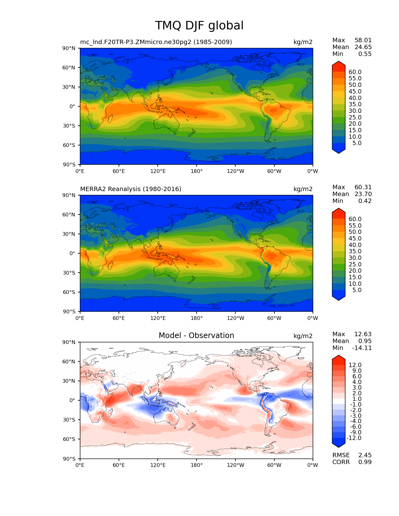 Use this command to recreate this image: | e3sm_diags lat_lon --no_viewer --case_id 'MERRA2' --sets 'lat_lon' --run_type 'model_vs_obs' --variables 'TMQ' --seasons 'DJF' --regions 'global' --regrid_tool 'esmf' --regrid_method 'conservative' --main_title 'TMQ DJF global' --backend 'mpl' --output_format 'png' --canvas_size_w '1212' --canvas_size_h '1628' --figsize '8.5' '11.0' --dpi '150' --arrows --contour_levels '5' '10' '15' '20' '25' '30' '35' '40' '45' '50' '55' '60' --test_name 'mc_lnd.F20TR-P3.ZMmicro.ne30pg2' --test_title ' ' --test_colormap 'cet_rainbow.rgb' --ref_name 'MERRA2' --reference_name 'MERRA2 Reanalysis' --reference_colormap 'cet_rainbow.rgb' --diff_title 'Model - Observation' --diff_colormap 'diverging_bwr.rgb' --diff_levels '-12' '-9' '-6' '-4' '-3' '-2' '-1' '1' '2' '3' '4' '6' '9' '12' --num_workers '4' --granulate 'variables' 'seasons' 'plevs' 'regions' --selectors 'sets' 'seasons' --reference_data_path '/global/cfs/cdirs/e3sm/acme_diags/obs_for_e3sm_diags/climatology/' --test_data_path '/global/cscratch1/sd/xsongsio/E3SM_simulations/mc_lnd.F20TR-P3.ZMmicro.ne30pg2/diag/clim_rgr/25yr/' --results_dir '/global/cfs/cdirs/e3sm/www/xsongsio/mc_lnd.F20TR-P3.ZMmicro.ne30pg2/25yr' |